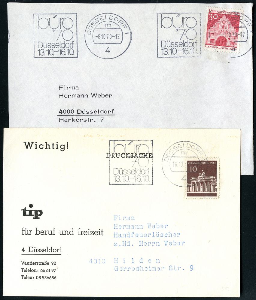 6314 | 12 € | 4000 Düsseldorf Maschinen- u. Serienstempel : 4 DÜSSELDORF 1/ mr #bzw.# rm/ büro/ 70.. 1970 (Okt.) MaWSt (Halbstempel) bzw. Band-MaWSt auf Bedarfs-Kt. bzw. Bedarfs-Bf. (etw. verkürzt) 2 Belege (Bo.343 A, Bd) | ![]() | |
