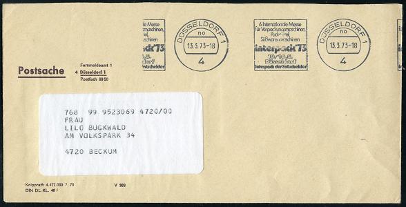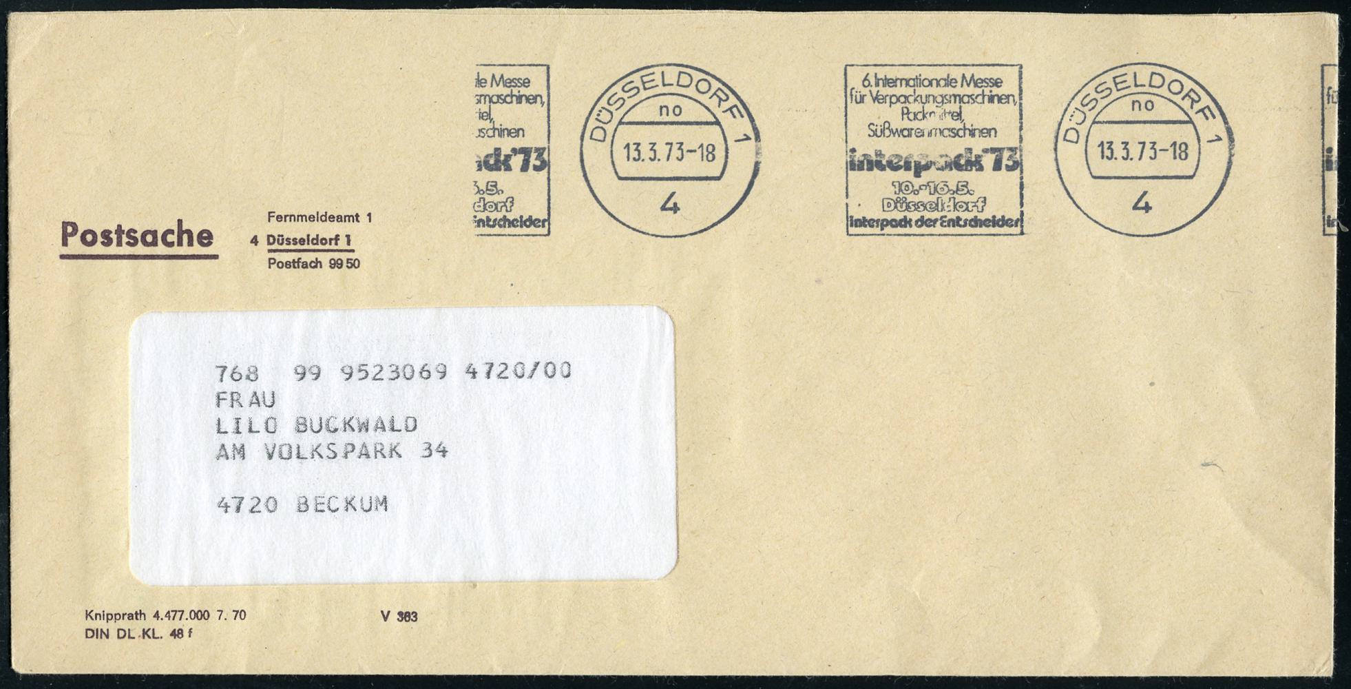 6315 | 8 € | 4000 Düsseldorf Maschinen- u. Serienstempel : 4 DÜSSELDORF 1/ no/ 6.Internat.Messe/ für Verpackungsmaschinen../ Süßwarenmaschinen/ Interpack´73 1973 (13.3.) Band-MaWSt auf Postdienst-Bf.: Fernmeldeamt 1.. (Bo.403 A III = UB "no") | ![]() | |