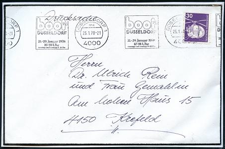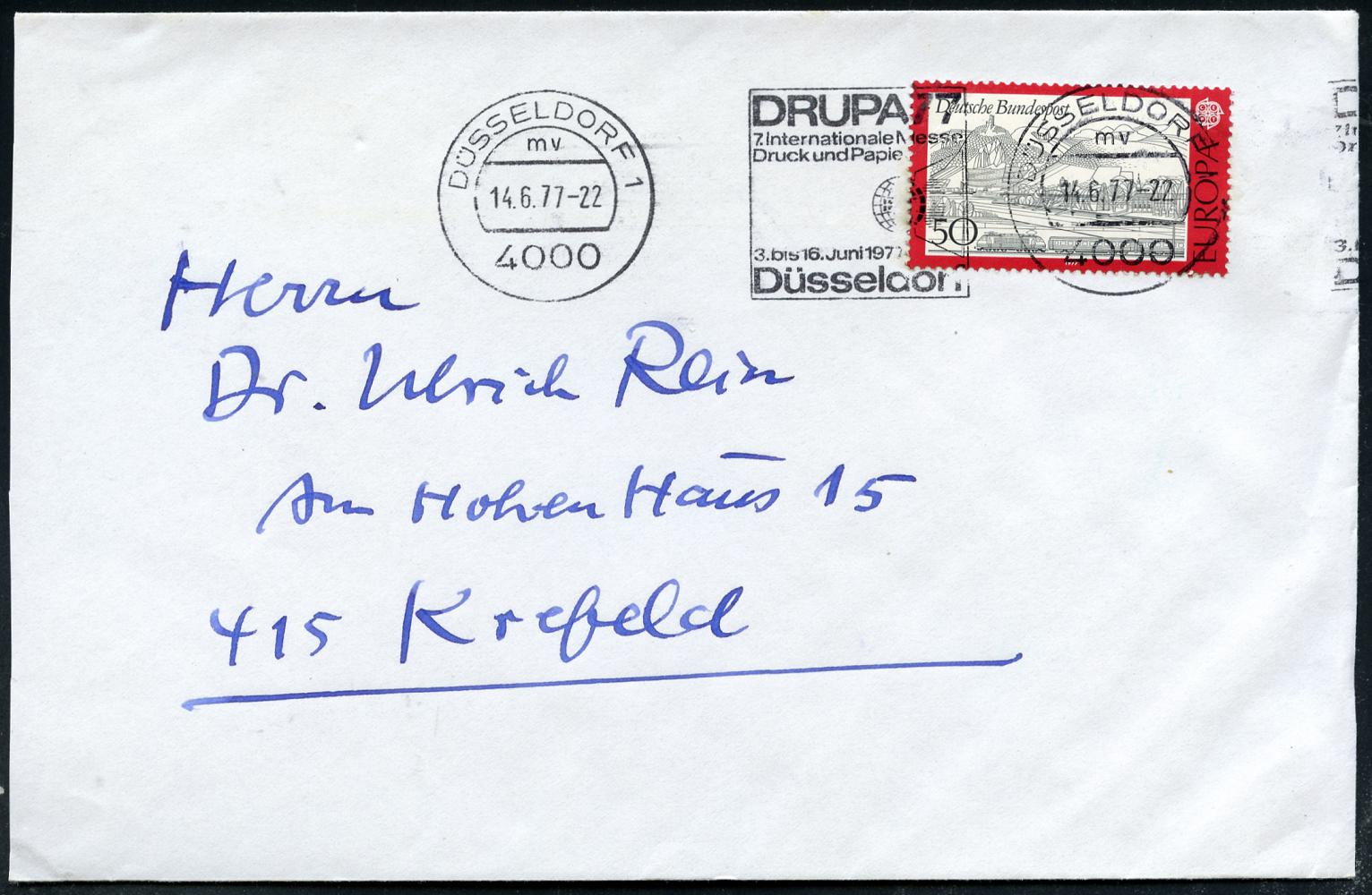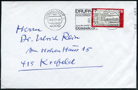 6318 | 7 € | 4000 Düsseldorf Maschinen- u. Serienstempel : 4000 DÜSSELDORF 1/ mv/ DRUPA´77/ 7.Internat.Messe/ Druck u.Papier.. 1977 (14.6.) Band-MaWSt auf Bedarfs-Bf. | ![]() | |