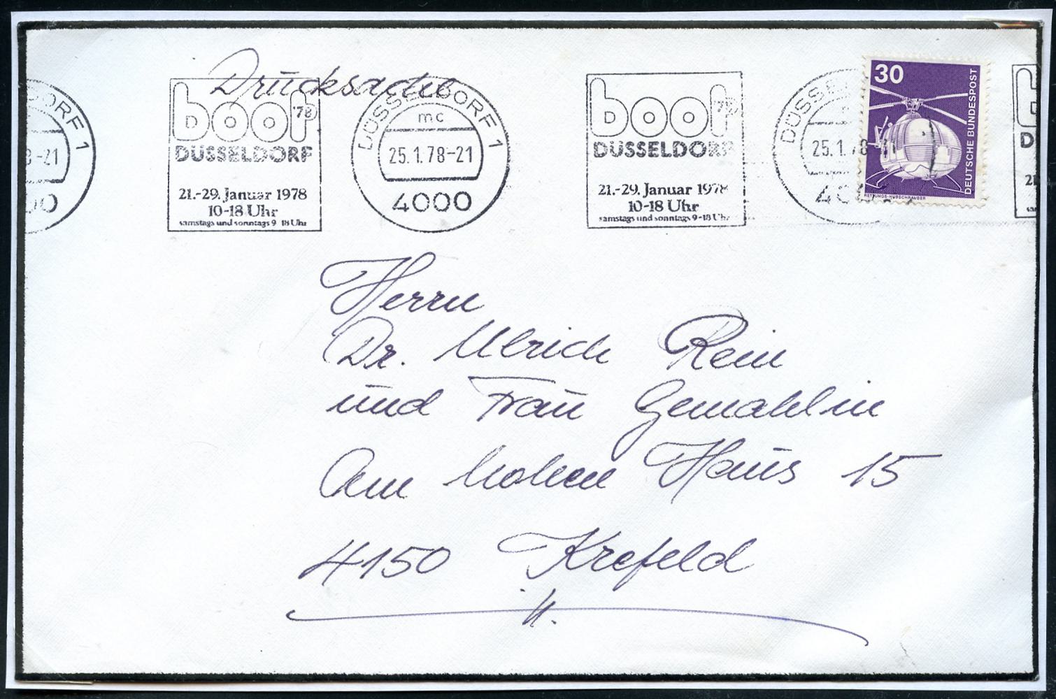 6319 | 8 € | 4000 Düsseldorf Maschinen- u. Serienstempel : 4000 DÜSSELDORF 1/ mc/ boot ´78.. 1978 (25.1.) Band-MaWSt auf Trauer-Bf. | ![]() | |