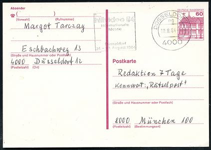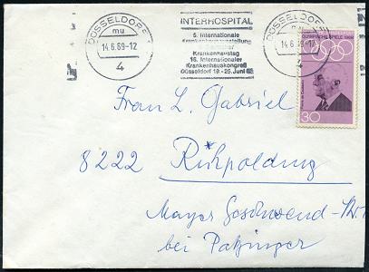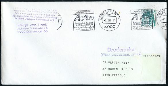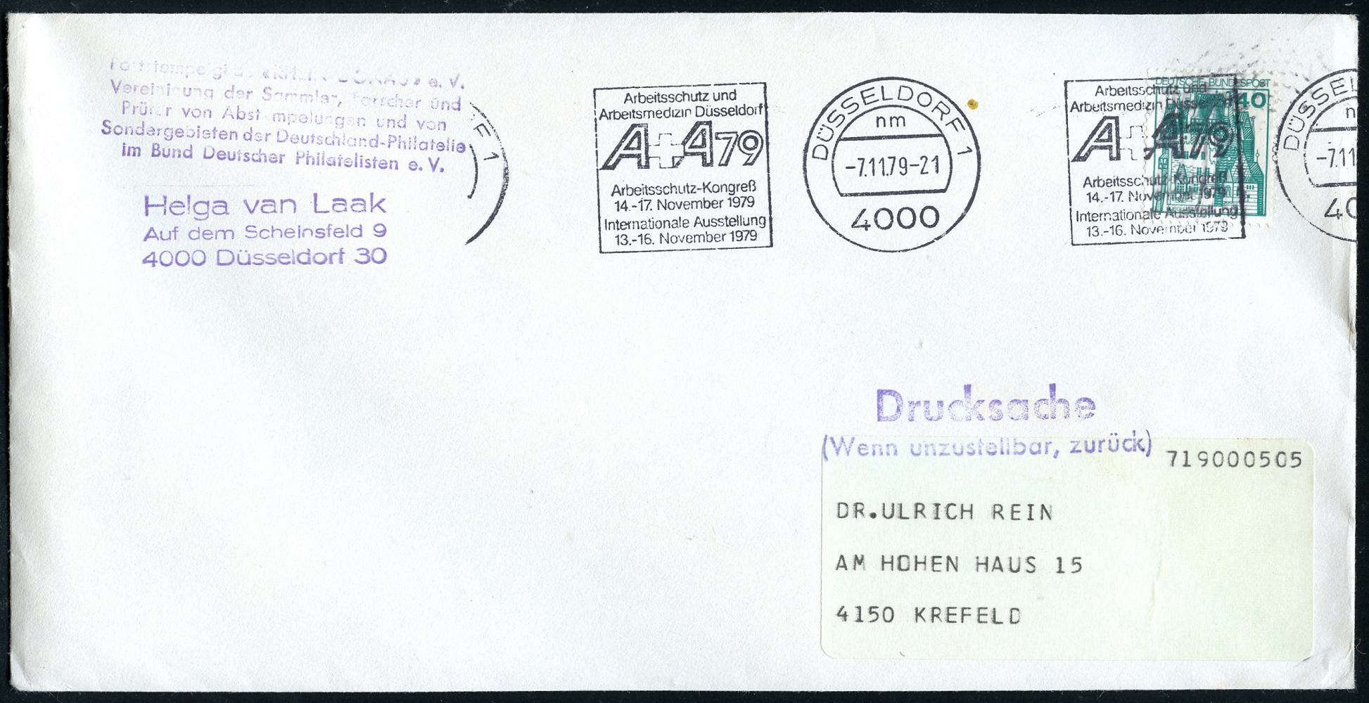 6320 | 7 € | 4000 Düsseldorf Maschinen- u. Serienstempel : 4000 DÜSSELDORF 1/ nm/ Arbeitsschutz u./ Arbeitsmedizin../ A+A 79/ Arbeitsschutz-Kongreß.. 1979 (7.11.) Band-MaWSt auf Bedarfs-Bf. | ![]() | |