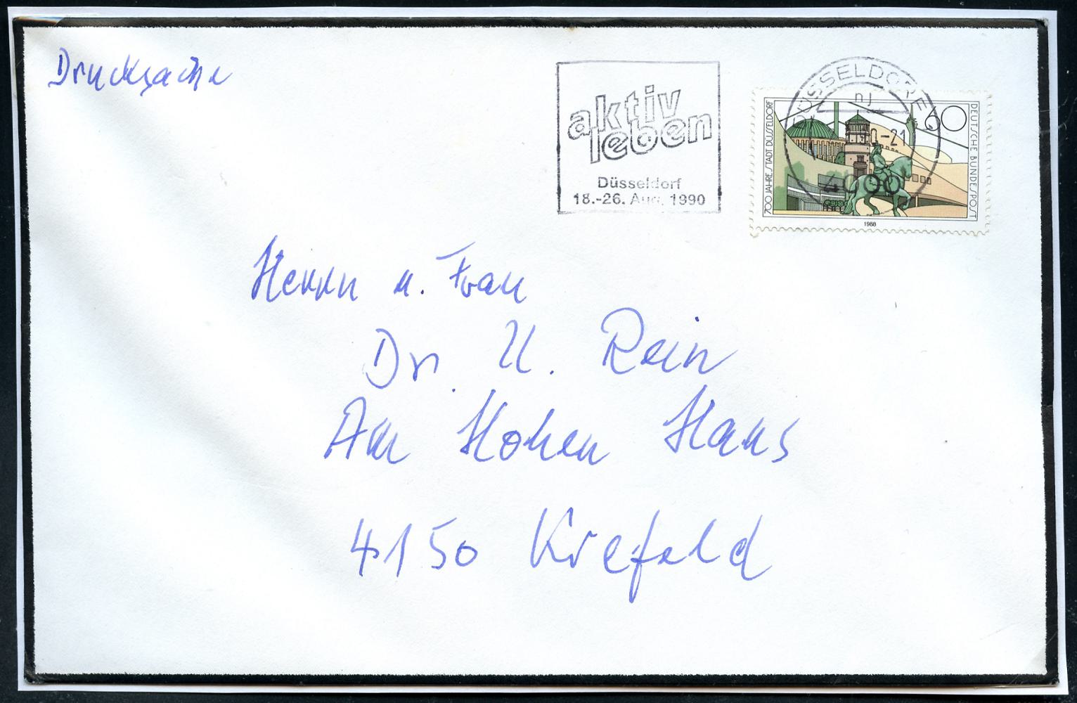 6333 | 6 € | 4000 Düsseldorf Maschinen- u. Serienstempel : 4000 DÜSSELDORF 1/ nj/ aktiv/ leben.. 1990 (7.7.) MaWSt kurioserweise auf Trauer-Bf., Bedarf | ![]() | |
