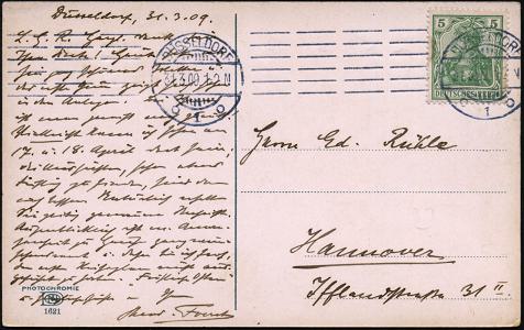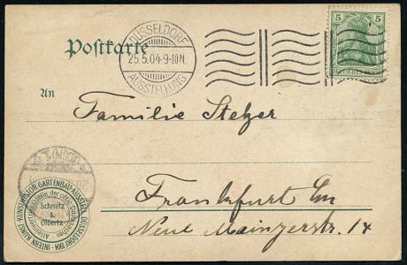 6264 | 25 € | 4000 Düsseldorf Maschinen- u. Serienstempel : DÜSSELDORF/ AUSSTELLUNG 1904 (25.5.) Sonder-MaWellenSt. = Bickerdike klar auf EF 5 Pf. Germania, Color-Sonder-Kt.: Kunst- u. Gartenbau-Ausstellung (Schwarzwaldhaus) Bedarfs-Fern-Kt. n. Ffm.,vs. AS. (Miller BW-9 / Nr.79) | ![]() ![]() | |
