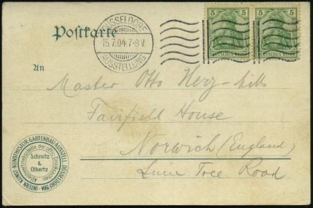 6262 | 28 € | 4000 Düsseldorf Maschinen- u. Serienstempel : DÜSSELDORF/ AUSSTELLUNG 1904 (21.6.) Sonder-MaWellenSt. = Typ Bickerdike auf EF 2 Pf. Germania (Mi.68 EF) Color-Sonder-Kt.: INTERNAT. KUNST- GARTENBAU-AUSSTELLUNG (Panorama) klar gest. Bedarfs-Ortskt. (Miller BW-9, Nr.79) | ![]() ![]() | |