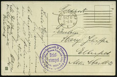 6267 | 15 € | 4000 Düsseldorf Maschinen- u. Serienstempel : DÜSSELDORF/ s1s 1917 (31.12.) Maschinen-Strich-Stpl. (Typ Universal) + viol. Resevelazarett II Düsseldorf/ Vereinslazarett/Frau Konsul Friedrich.. , klar gest., patriot. Color-Litho-Feldpost-Neujahrs-Ak. (Flaggen etc.) n. Wuppertal | ![]() ![]() | |