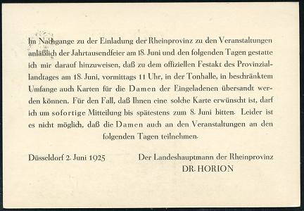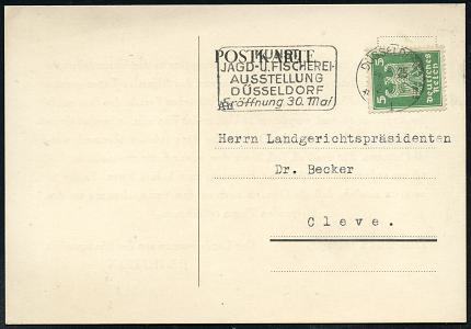 6270 | 25 € | 4000 Düsseldorf Maschinen- u. Serienstempel : DÜSSELDORF/ *1II/ KUNST-/ JAGD-U.FISCHEREI-/ AUSSTELLUNG.. 1925 (4.6.) MaWSt klar auf Einladungs-Kt. zur "Jahrtausendfeier Rheinland" vom Landeshauptmann Dr. Horion, seltener Beleg! (Bo.16 A II) | ![]() ![]() | |
