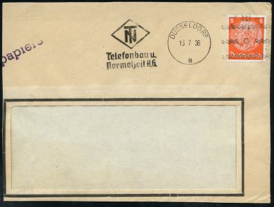 6281 | 18 € | 4000 Düsseldorf Maschinen- u. Serienstempel : DÜSSELDORF/ 8/ =18=/ TN/ Telefonbau u./ Normalzeit A.G. 1936 (16.7.) Freimarkenstempel mit Kennung, Vorausentwertung auf EF 8 Pf. Hindenbg. (TN-Logo) = Hersteller des Freimarkenstemplers zur Frankierung und Vorausentwertung!, gr. Briefstück + Info-Kopie, vergl. Kat.-Nr.6280 (Mi.517) | ![]() ![]() ![]() | |