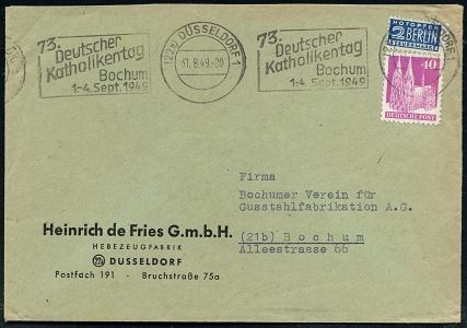 6286 | 16 € | 4000 Düsseldorf Maschinen- u. Serienstempel : (22a) DÜSSELDORF 1/ 73./ Deutscher/ Katholikentag/ Bochum 1949 (Aug.) Serien-Band-MWSt auf EF 40 Pf. Bauten + 2 Pf. NoB, gez. , klar gest. Firmen-Bf.: Heinrich de Fries GmbH, Hebezeugfabrik.. (Bo.S 498 Bd , nur in 2 Orten verwendet!) | ![]() | |