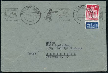 6289 | 16 € | 4000 Düsseldorf Maschinen- u. Serienstempel : (22a) DÜSSELDORF 1/ ten Hoff/ - Neusel/ 18.SEPT. 1949 (Sept.) seltener Band-MWSt (Box-Piktogramm) Bedarfs-Inl.-Bf. (Bo.65 Bd II) | ![]() | |
