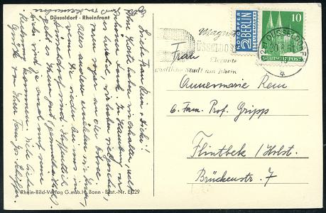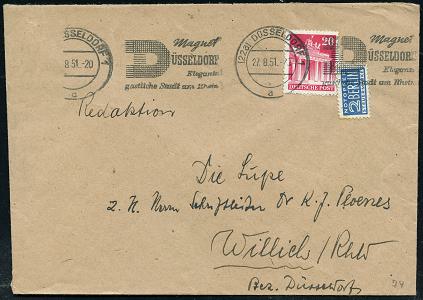 6294 | 12 € | 4000 Düsseldorf Maschinen- u. Serienstempel : (22a) DÜSSELDORF 1/ a/ Magnet/ DÜSSELDORF/ Elegante/ gastliche Stadt.. 1951 (27.8.) Band-MWSt mit UB "a" (Magnet) Bedarf-Bf. (Bo.74 Bd mit UB "a") | ![]() | |