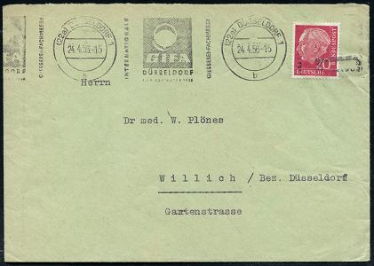 6297 | 16 € | 4000 Düsseldorf Maschinen- u. Serienstempel : (22a) DÜSSELDORF 1/ b/ GIFA/ INTERNAT./ GIESSEREI-FACHMESSE 1956 (24.4.) Band-MWSt (Schmelztiegel) auf Bedarfs-Bf. (Bo.119 Bd I) | ![]() | |