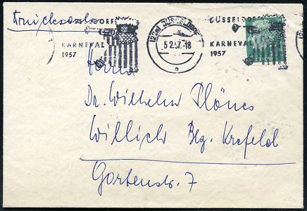 6299 | 12 € | 4000 Düsseldorf Maschinen- u. Serienstempel : (22a) DÜSSELDORF 1/ b/ ..KARNEVAL/ 1957 1957 (5.2.) Band-MaWSt = Clown-Trompeter auf Bedarfs-Bf. (Bo.126 Bd I) | ![]() | |