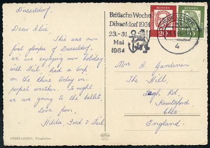 6303 | 14 € | 4000 Düsseldorf Maschinen- u. Serienstempel : 4 DÜSSELDORF 1/ mb/ Britische Woche.. 1964 (25.5.) MaWSt (Wappenlöwe mit Anker) Ausl.-Color-Foto-Ak.: Düsseldorf Flughafen n. England (Bo.213 A) | ![]() ![]() | |