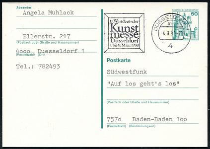6321 | 5 € | 4000 Düsseldorf Maschinen- u. Serienstempel : 4 DÜSSELDORF 1/ ml/ 11.Westdeutsche/ Kunst/ messe/ ..1.bis 9.März 1980 (4.3.) MWSt (Bilder-Rahmen) Bedarf | ![]() | |