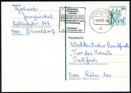 6324 | 5 € | 4000 Düsseldorf Maschinen- u. Serienstempel : 4 DÜSSELDORF 1/ mi/ Diagnostica/ Therapeutika../ MEDICA 80.. 1980 (4.11.) MaWSt , Bedarfs-Kt. | ![]() | |