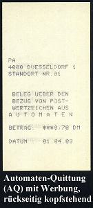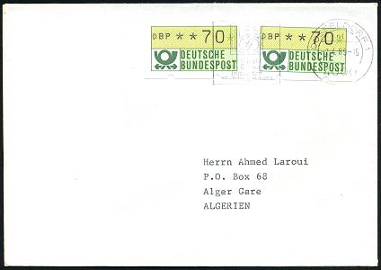 6332 | 15 € | 4000 Düsseldorf Maschinen- u. Serienstempel : 4000 DÜSSELDORF 1/ nl/ Weltmarkt.. 1989 (2.4.) MaWSt auf 2 Stück ATM 70 Pf., reine MeF. + 2 ATM-Quittungen , Übersee-Bf. n. Algerien, 3 Belege kompl., seltene Destination! (Mi.1, AQ.2.1.) | ![]() ![]() | |