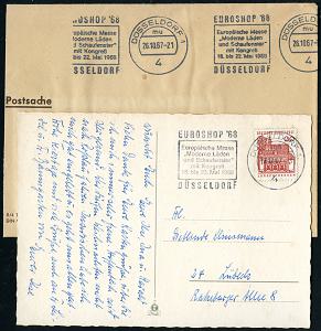 6312 | 14 € | 4000 Düsseldorf Maschinen- u. Serienstempel : 4 DÜSSELDORF 1/ mh #bzw.# mu/ EUROSHOP´68/ Europ.Messe/ "Moderne Läden/ u.Schaufenster".. 1967 (Okt./Dez.) MaWSt (Halbstempel) bzw. Band-MaWSt auf Weihnachts-Ak. bzw. Postdienst-Bf. (Einzelverkauf möglich: je 8.- EUR) 2 Belege (Bo.271 A, Bd) | ![]() | |