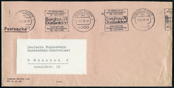 6316 | 7 € | 4000 Düsseldorf Maschinen- u. Serienstempel : 4000 DÜSSELDORF 1/ mv/ IX.Weltbergbau-/ Kongreß../ Bergbau´76.. 1976 (7.5.) Band-MaWSt auf Postdienst-Bf. | ![]() | |