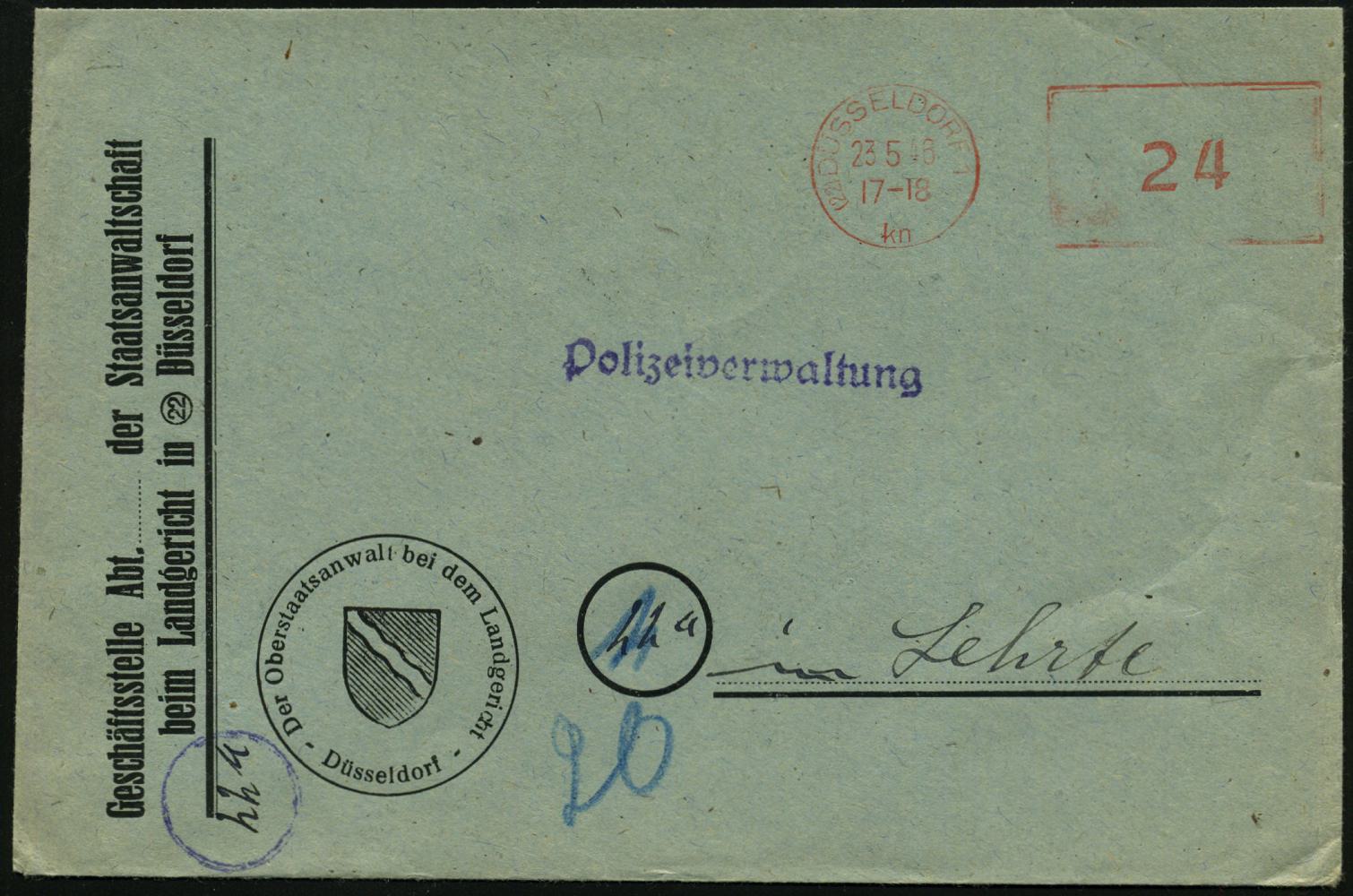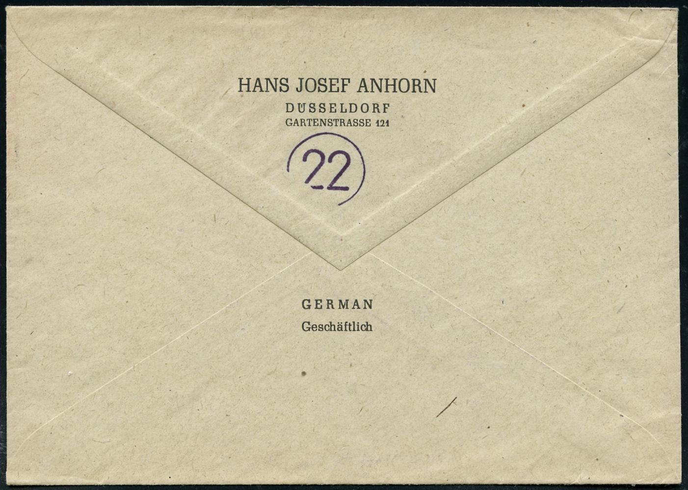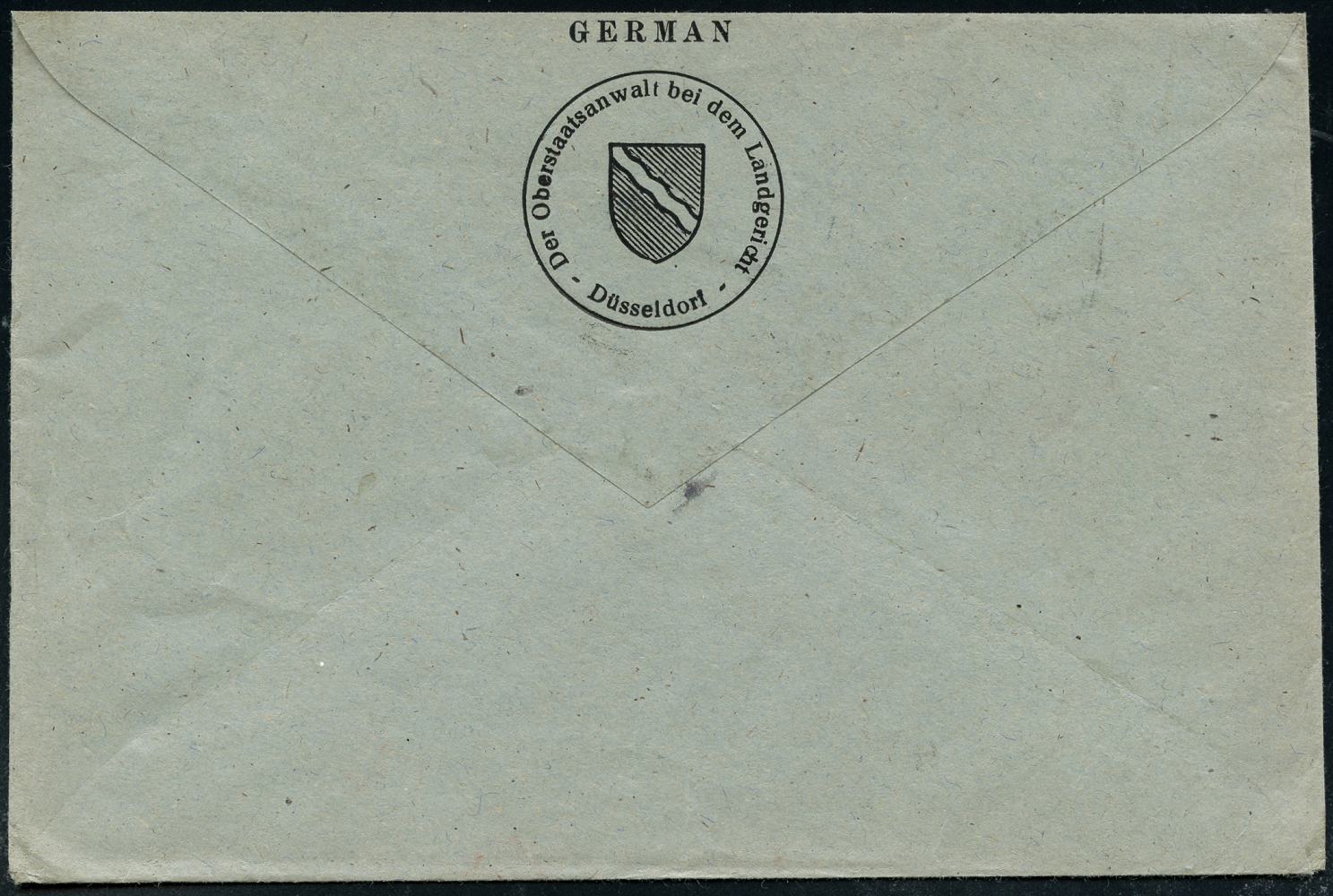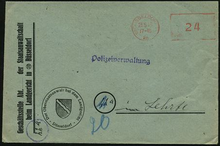 6366 | 20 € | 4000 Düsseldorf Post-Freistempel : (22) DÜSSELDORF 1/ kn 1948 (23.5.) entnazifizierter, aptierter PFS "Hakenkreuz/Adlerkopf" = entfernt = Notmaßnahme, 24 Pf. Ziffer , Dienst-Bf.: Staatsanwaltschaft.., Fern-Doppelbf.!, seltene Portostufe! (Dü.D-8 / Nr.240) | ![]() ![]() | |