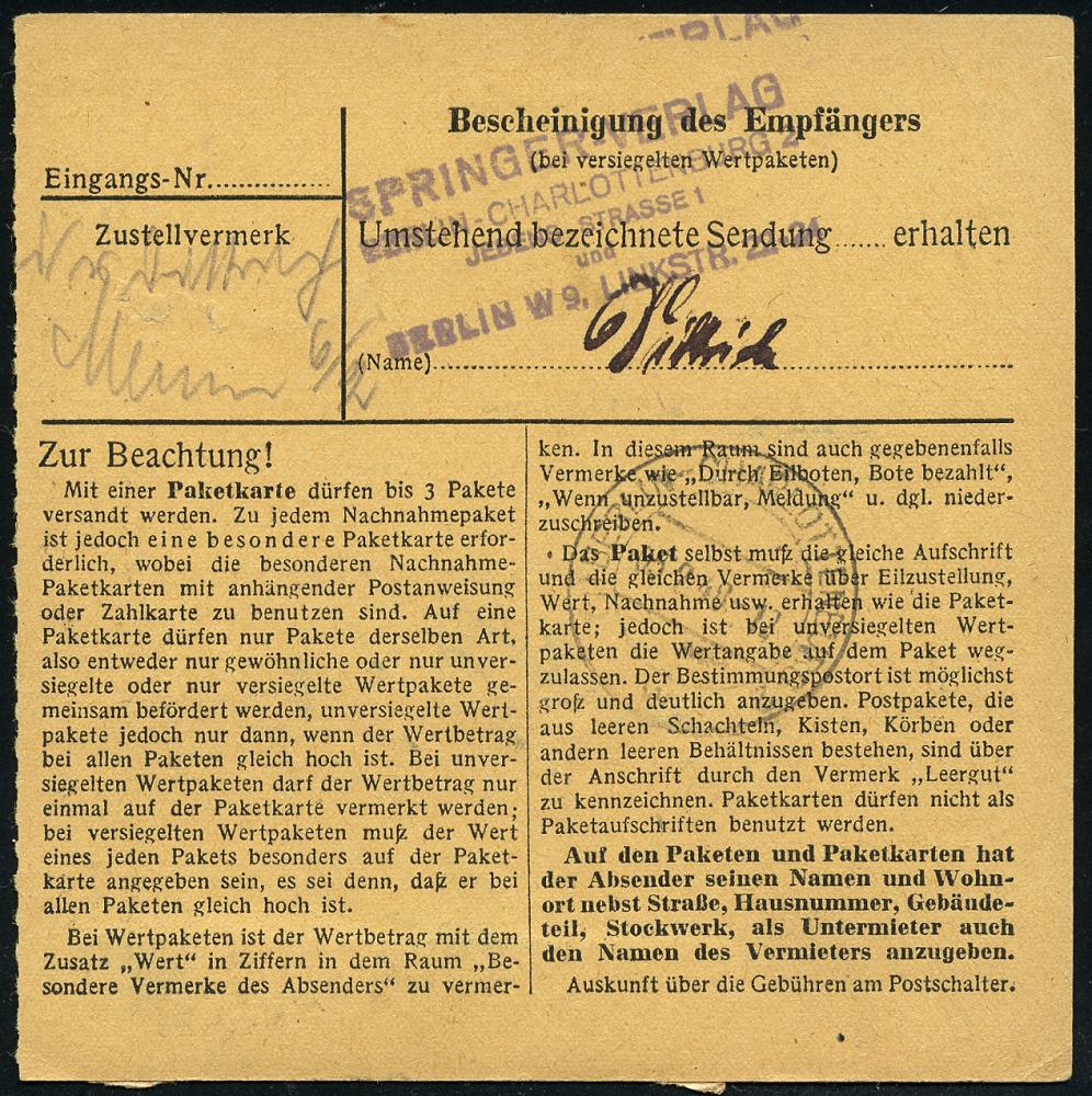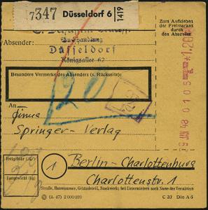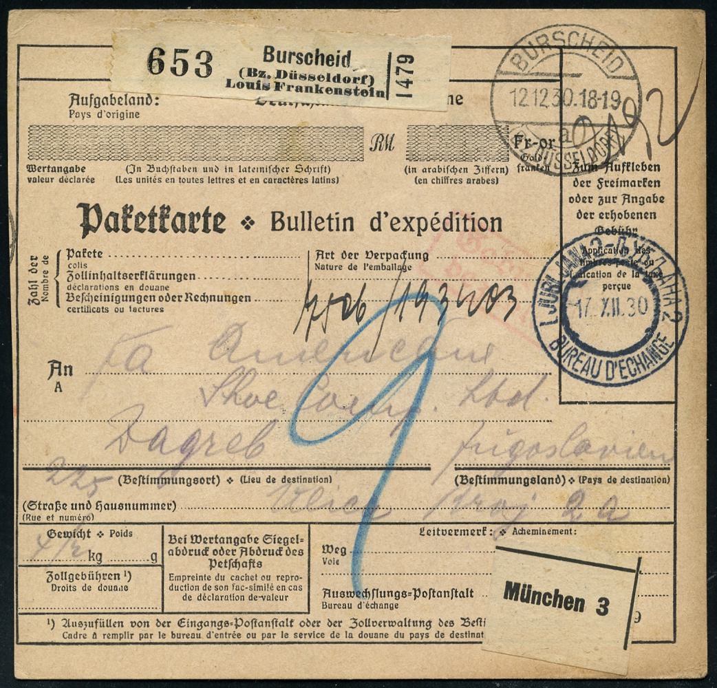 6360 | 30 € | 4000 Düsseldorf Post-Freistempel : Düsseldorf-Burscheid 1930 (12.12.) 1K-Brücke: BURSCHEID/a/(Bz. DÜSSELDORF) + schw. Selbstbucher-Paketzettel: Burscheid/ (Bz. Düsseldorf)/ Louis Frankenstein + roter Ra.2: Gebühr/ bezahlt + Leitzettel: München 3, klar gest. Ausl.-Selbstbucher-Paket-Kt. n. Zagreb, rs. jugoslaw. Fiskal- u. Tax-Marken | ![]() ![]() | |