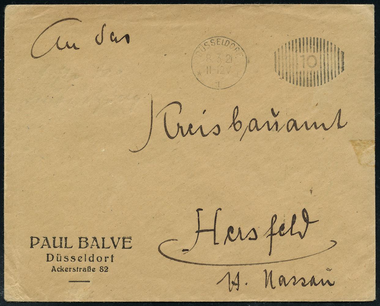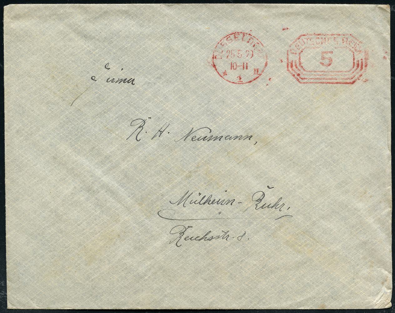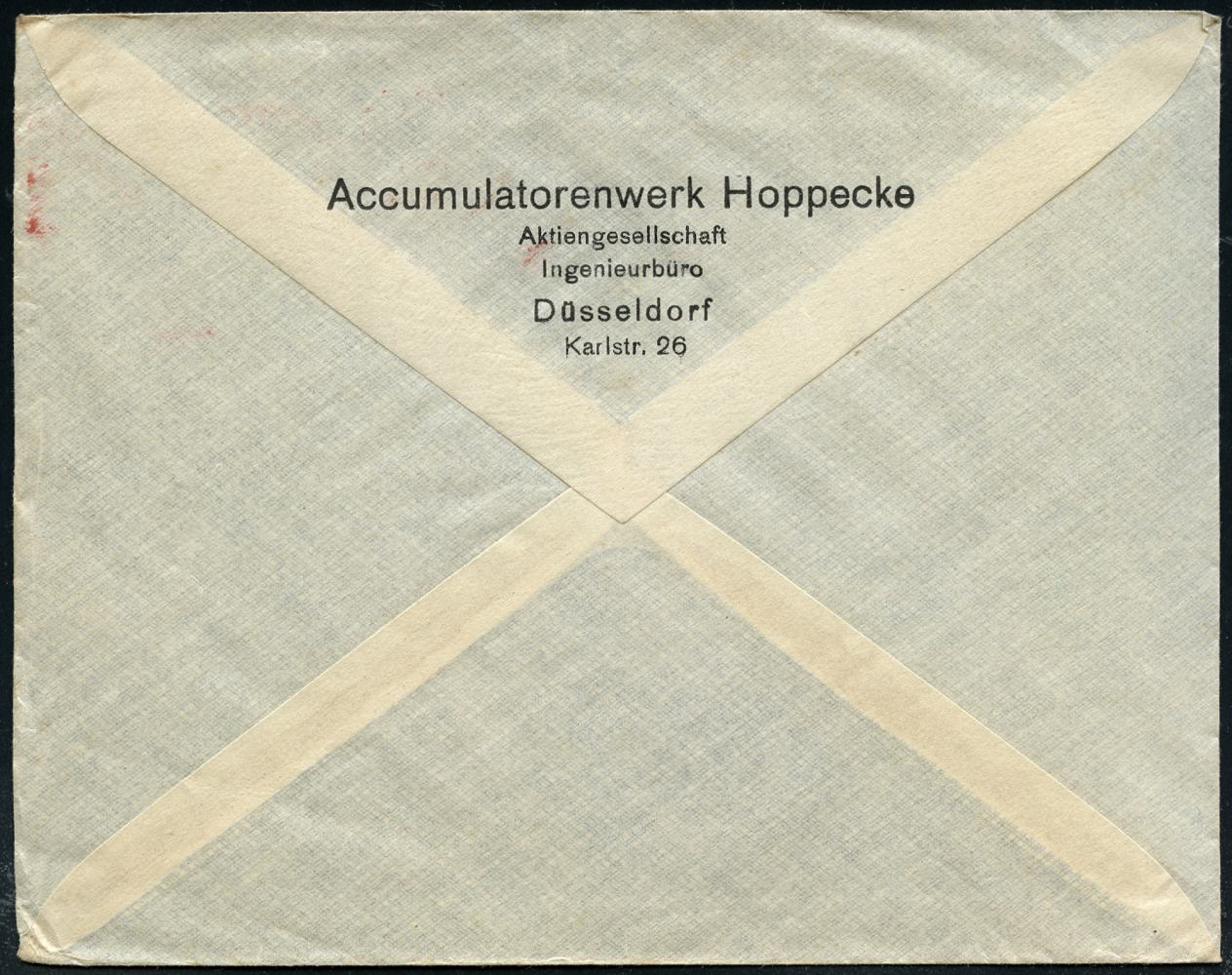 6359 | 8 € | 4000 Düsseldorf Post-Freistempel : DÜSSELDORF/ *1II/ DEUTSCHES REICH 1929 (25.5.) PFS "Achteck" 5 Pf. auf Firmen-Bf., rs. Abs.-Vordruck: Accumulatorenwerk Hoppecke AG.. (Dü.D-4) | ![]() ![]() ![]() | |