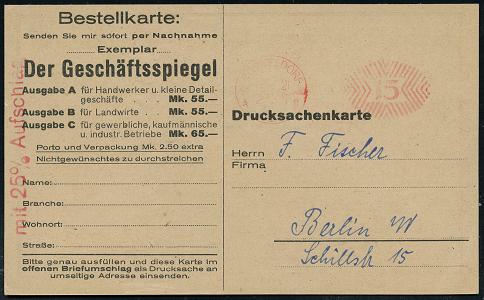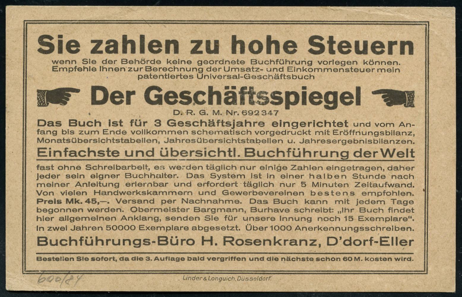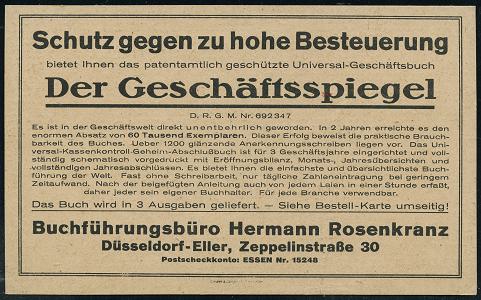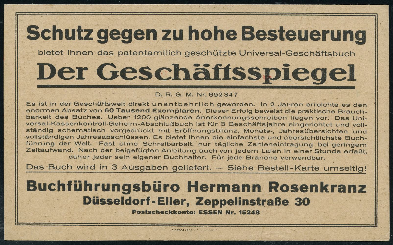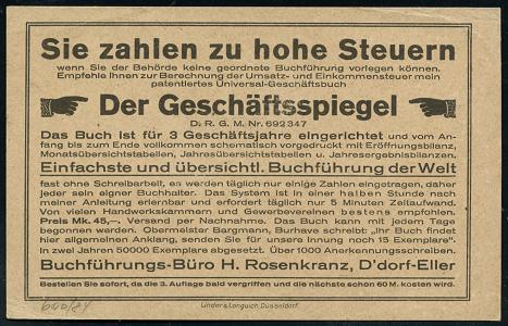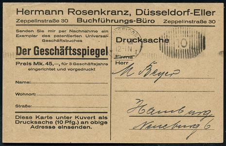 6335 | 18 € | 4000 Düsseldorf Post-Freistempel : DÜSSELDORF/ * 1 I 1921 (31.3.) schwarzer Ziermuster-PFS 10 Pf. auf Reklame-Kt.: Herrmann Rosenkranz, Düsseldorf-Eller über Steuer-Literatur "Der Geschäftsspiegel" (Dü.D-1, Nr.1) | ![]() ![]() | |