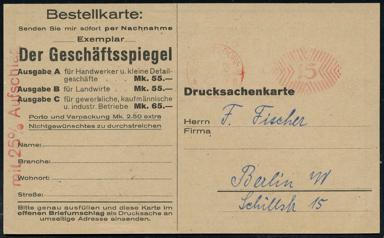 6336 | 18 € | 4000 Düsseldorf Post-Freistempel : DÜSSELDORF/ * 1 II 1921 (8.5.) roter Ziermuster.PFS 15 Pf. auf Infla-Reklame-Kt.: Herrmann Rosenkranz, Düsseldorf-Eller +ber Steuer-Literatur "Der Geschäftsspiegel" + roter Infla-Zusatzstpl.: mit 25% Aufschlag (Dü.D-1, Nr.8) | ![]() ![]() | |
