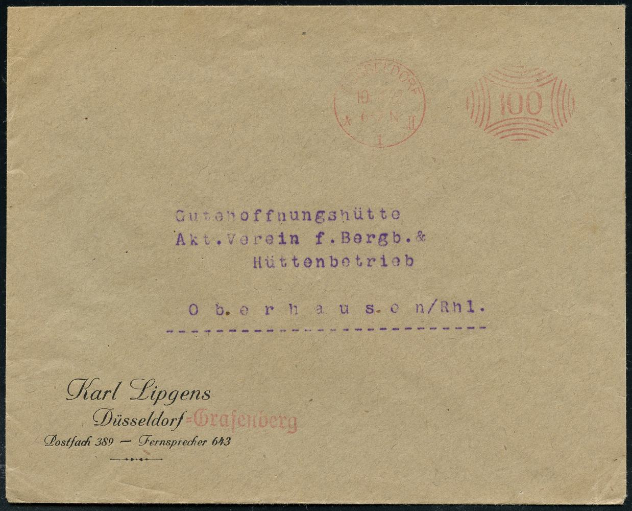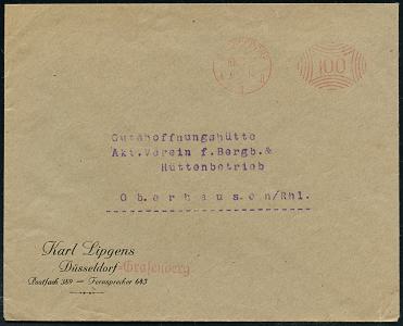 6338 | 15 € | 4000 Düsseldorf Post-Freistempel : DÜSSELDORF/ * 1 II 1921 (10.12.) roter Ziermuster-PFS 100 Pf. auf Firmen-Bf.: Karl Lipgens, Düsseldorf-Grafenberg.. (Dü.D-1, Nr.15) | ![]() | |
