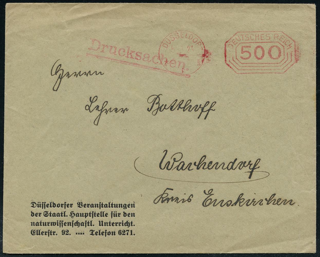 6341 | 14 € | 4000 Düsseldorf Post-Freistempel : DÜSSELDORF/ *1II/ DEUTSCHES REICH 1923 (5.1.) PFS "Achteck" 500 Pf. auf Dienst-Bf.: Düsseldorfer Veranstaltungen der Staatl. Hauptstelle für den naturwissenschaftl. Unterricht (Dü.D-3, Nr.36) | ![]() | |
