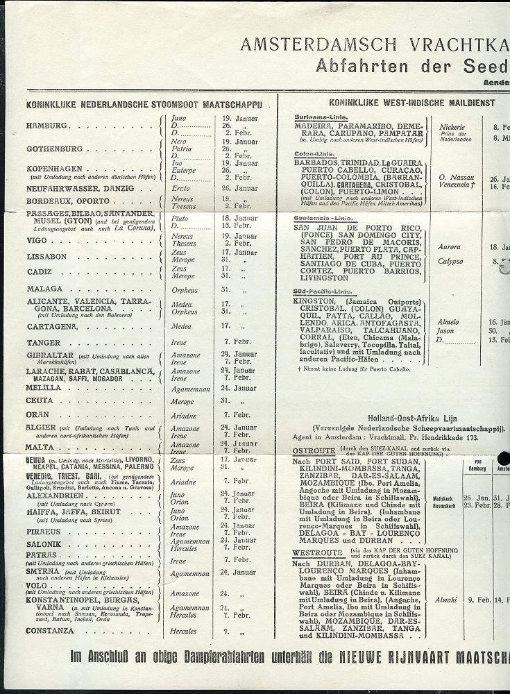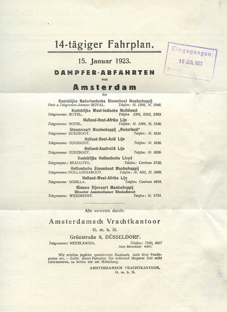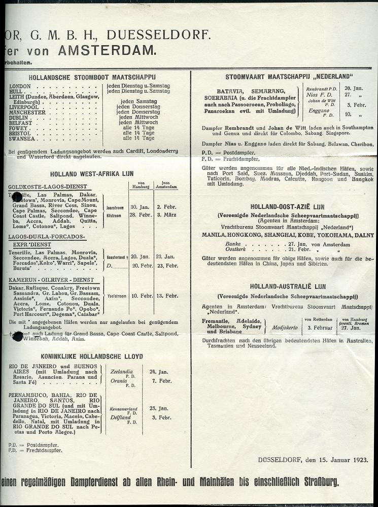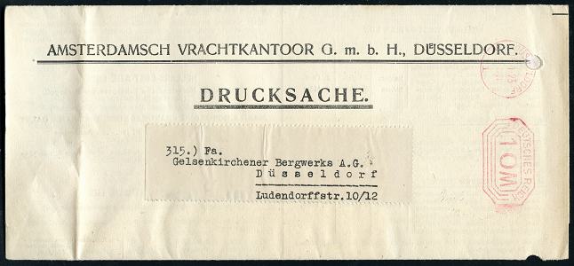 6342 | 16 € | 4000 Düsseldorf Post-Freistempel : DÜSSELDORF/ *1II/ DEUTSCHES REICH 1923 (16.1.) PFS "Achteck" 10 M(ark) auf Doppel-Falt-Bf. der Reederei AMSTERDAMSCH VRACHTKANTOOR.. (1x Reg.-Lochung) mit umfangreichen Fahrplänen von Frachtschiffen Europa u. Übersee, = infla-bedingte Remailing-Aktion der Reederei (Dü.D-3, Nr.39) | ![]() ![]() ![]() ![]() | |