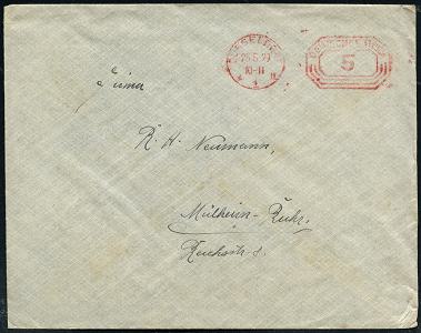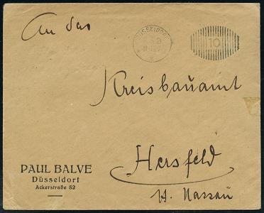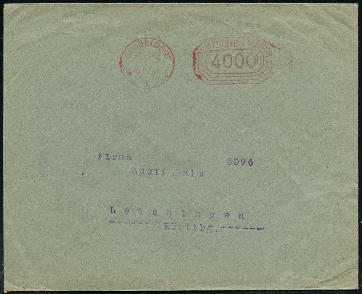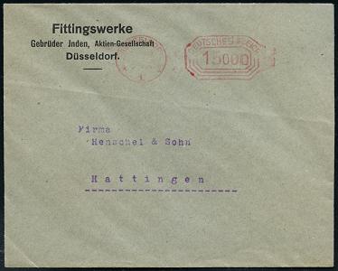 6346 | 30 € | 4000 Düsseldorf Post-Freistempel : DÜSSELDORF/ *1II/ DEUTSCHES REICH 1923 (10.9.) PFS "Achteck" 15 000 (Mark) auf Firmen-Bf.: Fittingswerke, Gebr. Jnden AG.., seltene Portostufe! (Dü.D-3, Nr.89) | ![]() | |