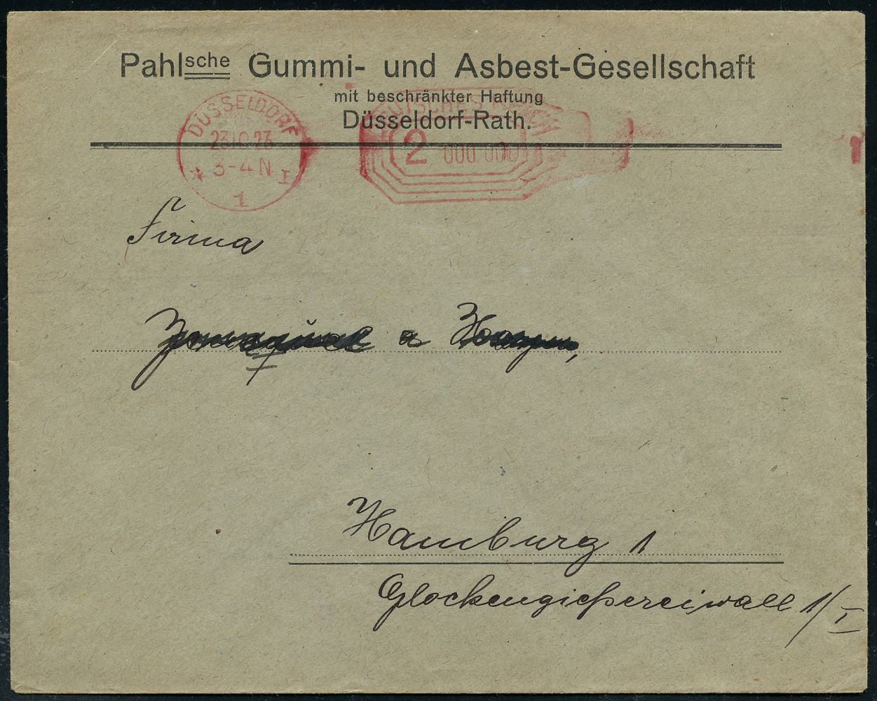 6348 | 18 € | 4000 Düsseldorf Post-Freistempel : DÜSSELDORF/ *1I/ DEUTSCHES REICH 1923 (23.10.) PFS "Achteck" 2 000 000 (Mark) auf Firmen-Bf.: Pahl´sche Gummi- u. Asbest GmbH, Hoch-Inflations-Beleg! (Dü.D-3, Nr.125) | ![]() | |