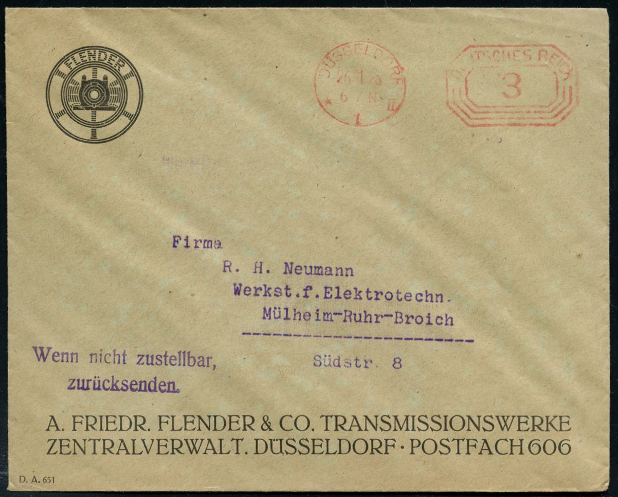 6350 | 10 € | 4000 Düsseldorf Post-Freistempel : DÜSSELDORF/ *1II/ DEUTSCHES REICH 1926 (26.1.) PFS "Achteck" 3 Pf. auf illustriertem Firmen-Bf.: A. FRIEDR. FLENDER & CO. TRANSMISSIONSWERKE.. (Firmen-Logo) (Dü.D-4) | ![]() ![]() | |