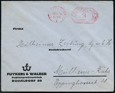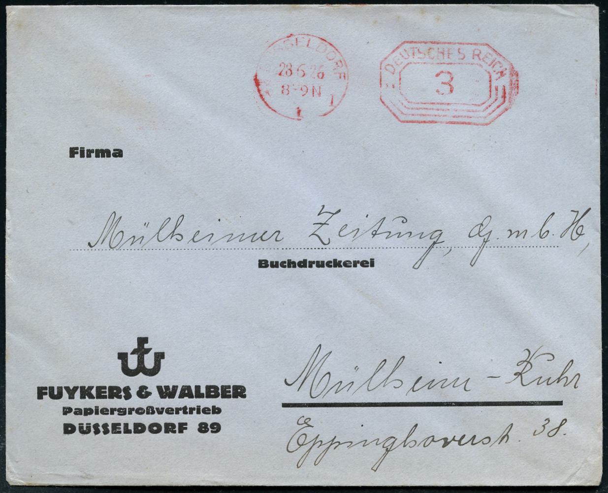 6351 | 8 € | 4000 Düsseldorf Post-Freistempel : DÜSSELDORF/ *1I/ DEUTSCHES REICH 1926 (28.6.) PFS "Achteck" 3 Pf. auf Firmen-Bf.: FUYKERS & WALBER, Papiergroßvertrieb.. (Dü.D-4) | ![]() ![]() | |