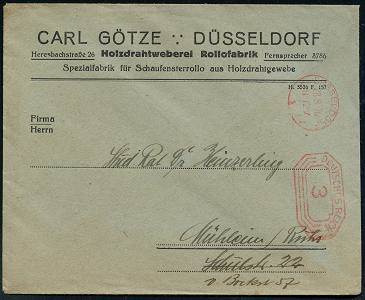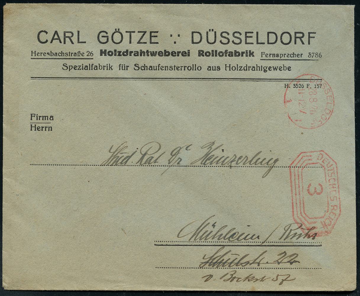 6352 | 8 € | 4000 Düsseldorf Post-Freistempel : DÜSSELDORF/ *1I/ DEUTSCHES REICH 1926 (26.8.) PFS "Achteck" 3 Pf. auf Firmen-Bf.: CARL GÖTZE.. Holzdrahtweberei Rollofabrik.. (Dü.D-4) | ![]() ![]() | |