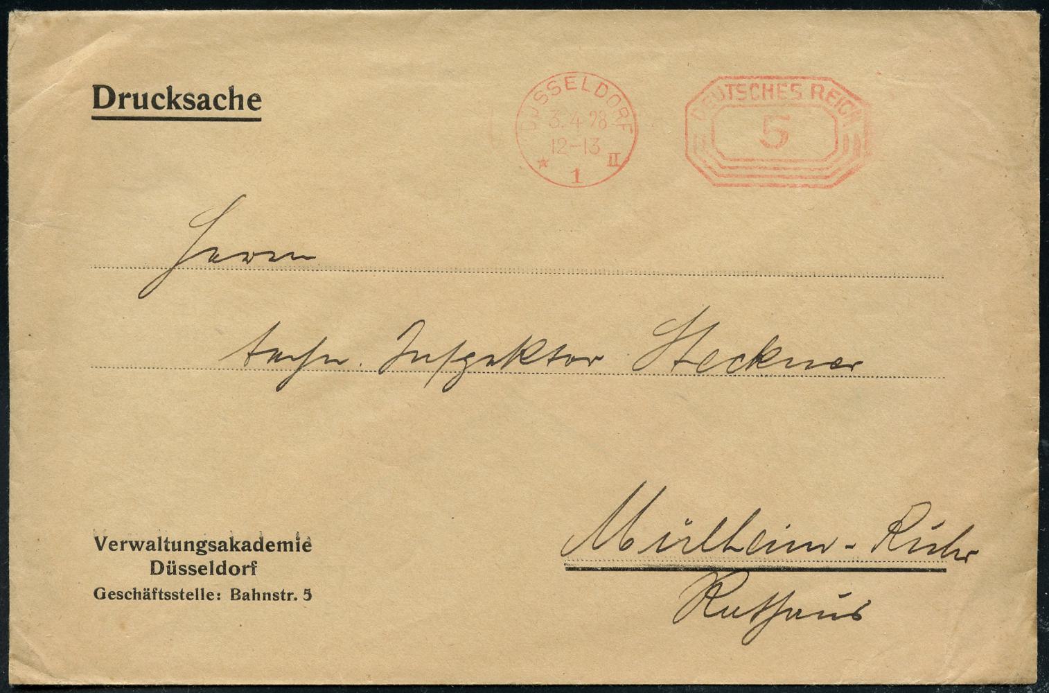 6356 | 10 € | 4000 Düsseldorf Post-Freistempel : DÜSSELDORF/ *1II/ DEUTSCHES REICH 1928 (3.4.) PFS "Achteck" 5 Pf. auf Dienst-Bf.: Verwaltungsakademie.. (Dü.D-4) | ![]() ![]() | |