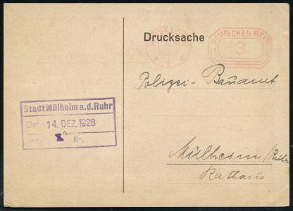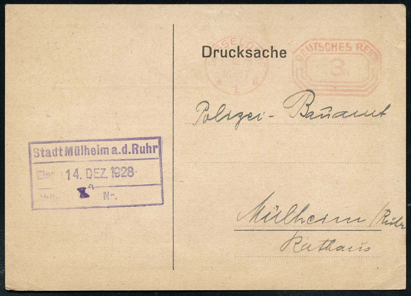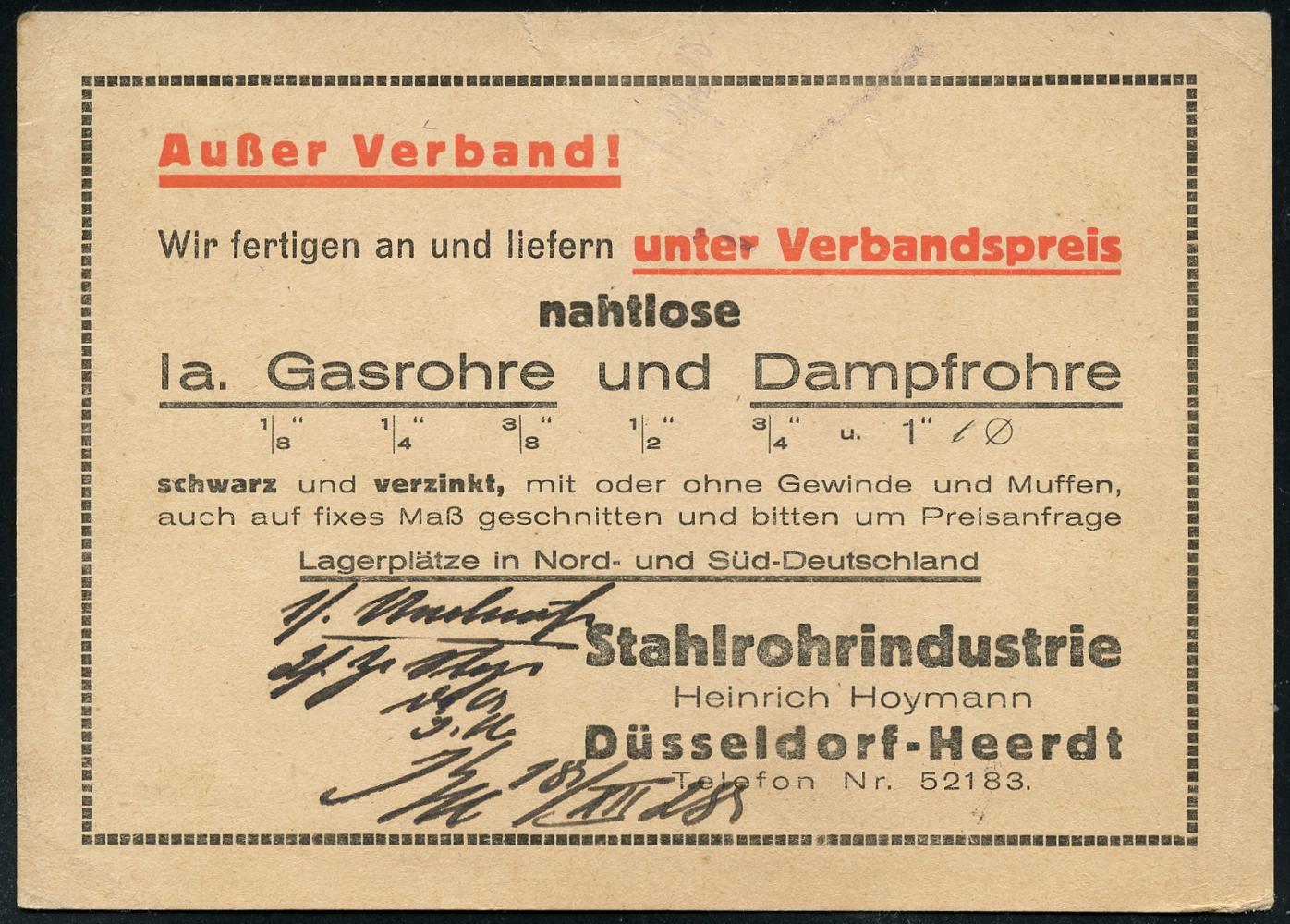 6357 | 12 € | 4000 Düsseldorf Post-Freistempel : DÜSSELDORF/ *1II/ DEUTSCHES REICH 1928 (12.12.) PFS "Achteck" 3 Pf. auf zweifarbiger Reklame-Kt.: Stahlrohrindustrie Heinrich Hoymann für Gas- u. Dampfrohre (Dü.D-4) | ![]() ![]() ![]() | |