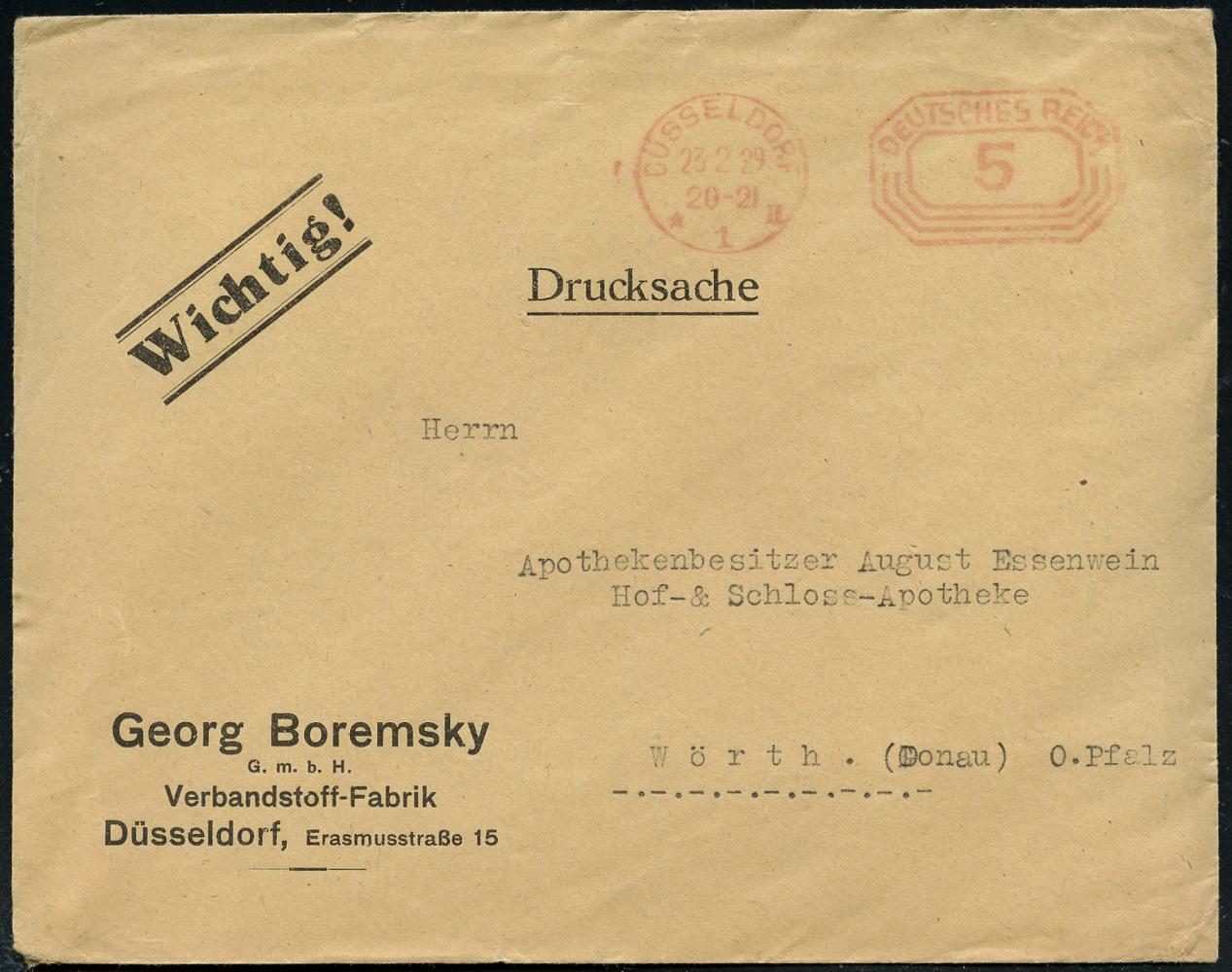 6358 | 8 € | 4000 Düsseldorf Post-Freistempel : DÜSSELDORF/ *1II/ DEUTSCHES REICH 1929 (23.2.) PFS "Achteck" 5 Pf. auf Firmen-Bf.: Georg Boremsky GmbH, Verbandstoff-Fabrik.. (Dü.D-4) | ![]() ![]() | |
