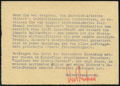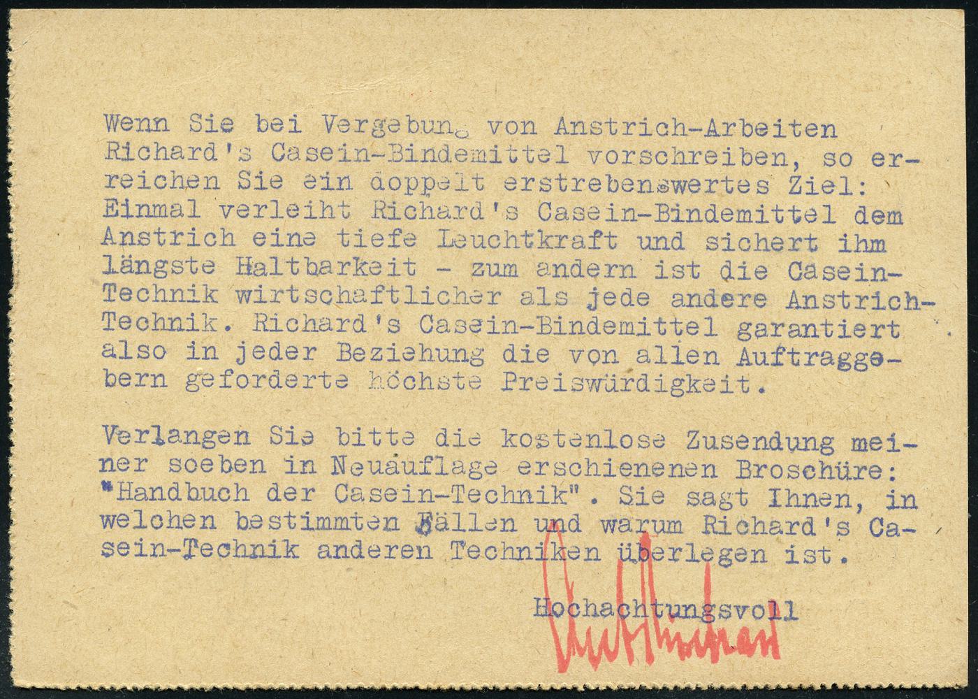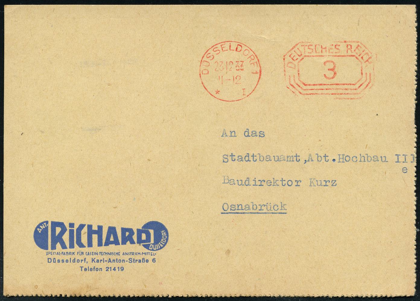 6361 | 10 € | 4000 Düsseldorf Post-Freistempel : DÜSSELDORF/ *1I/ DEUTSCHES REICH 1933 (27.12.) PFS "Achteck" 3 Pf. auf Firmen-Reklame-Kt.: ANT. RICHARD; SPECIALFABRIK FÜR CASEIN-TECHNISCHE ANSTRICHE.. (Dü.D-4) | ![]() ![]() ![]() | |