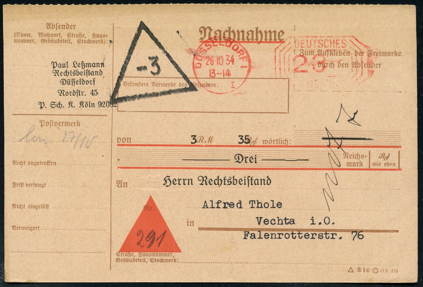 6362 | 15 € | 4000 Düsseldorf Post-Freistempel : DÜSSELDORF/ *1I/ DEUTSCHES REICH 1934 (26.10.) PFS "Achteck" 23 Pf. auf NN-Firmen-Kt.: Paul Lehmann, Rechtsbeistand.. + NN-Dreieck-Stpl. -3 n. Vechta, seltene Postfreistempel-Portostufe (Dü.D-4) | ![]() ![]() ![]() | |