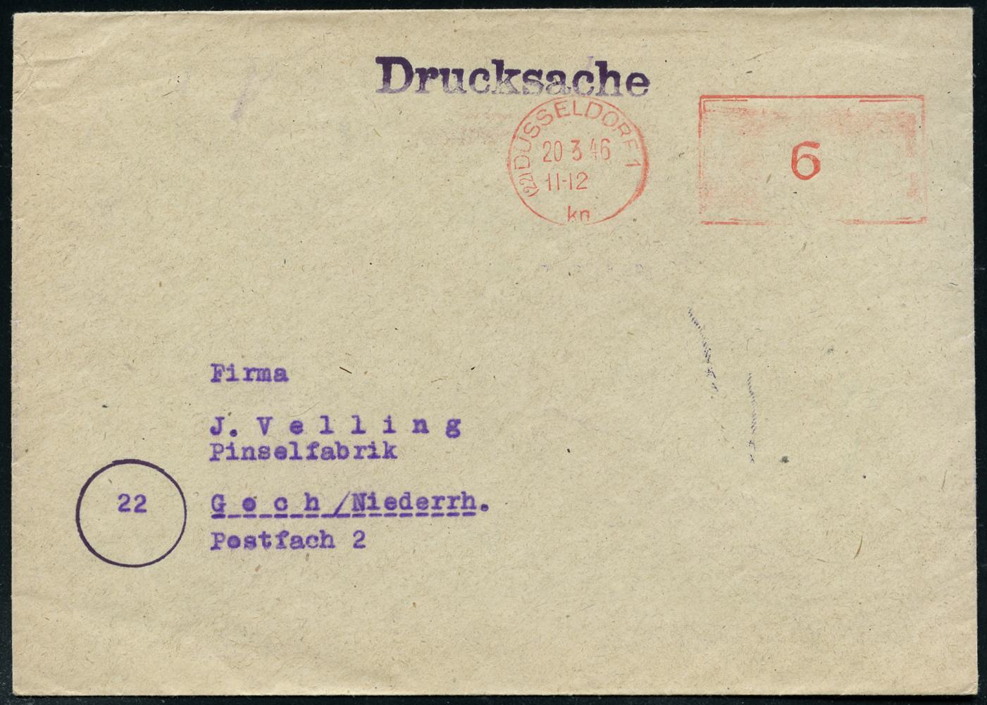 6365 | 16 € | 4000 Düsseldorf Post-Freistempel : (22) DÜSSELDORF 1/ kn 1946 (20.8.) entnazifizierter, aptierter PFS "Hakenkreuz/Adlerkopf" = entfernt, nur Einfassungslinie 6 Pf. = Notmaßnahme! (rs. Abs.: HANS JOSEF ANHORN..) Inl.-Drs.-Bf. (Dü.D-8, Nr.240) | ![]() ![]() | |