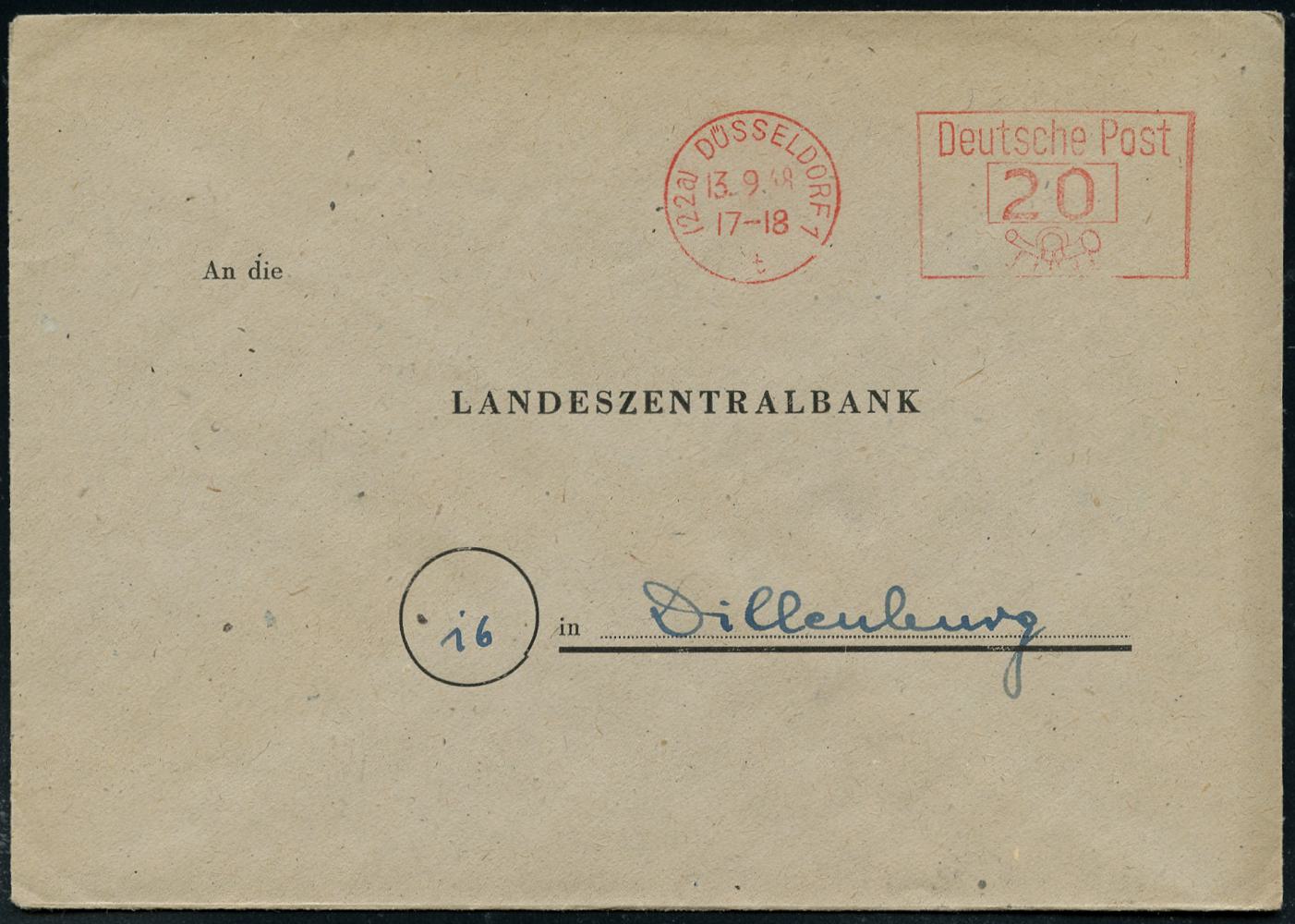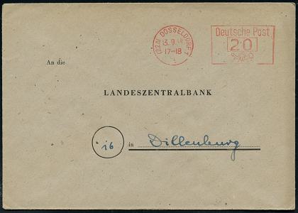 6368 | 16 € | 4000 Düsseldorf Post-Freistempel : (22a) DÜSSELDORF 1/ t/ Deutsche Post 1948 (13.9.) PFS "Posthorn" 20 Pf. = Briefporto! auf Dienst-Bf.: Landeszentralbank von Nordrhein-Westfalen.. (rs. Abs.-Vordruck) n. Dillenburg (Dü.D-14, Nr.267) | ![]() ![]() | |