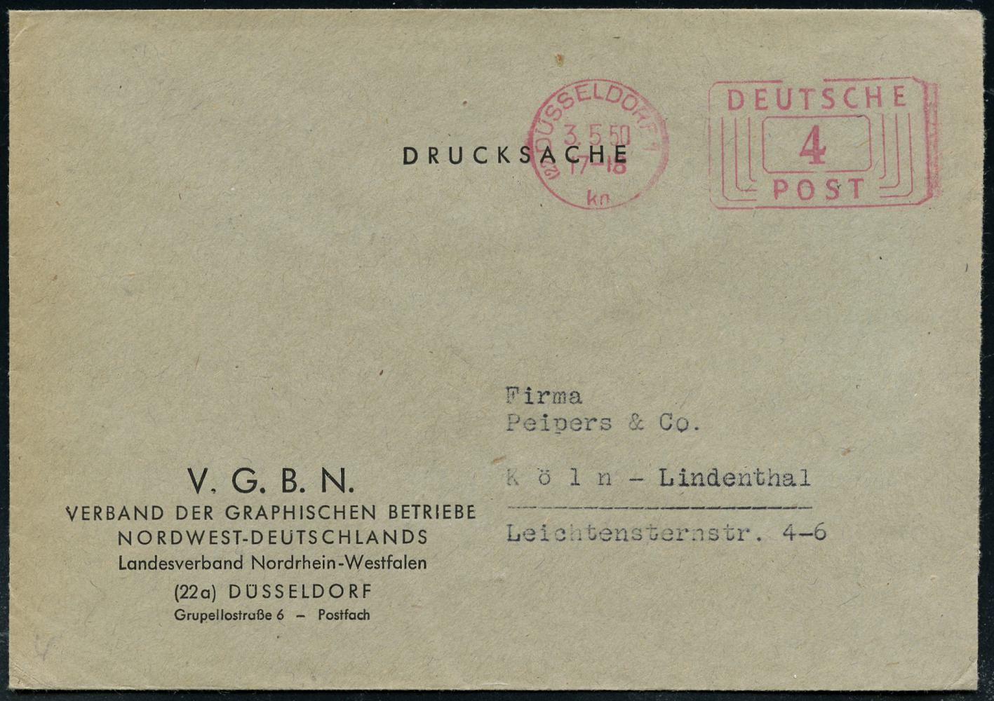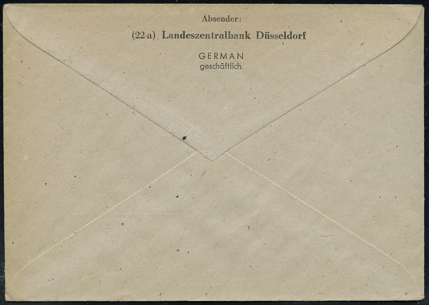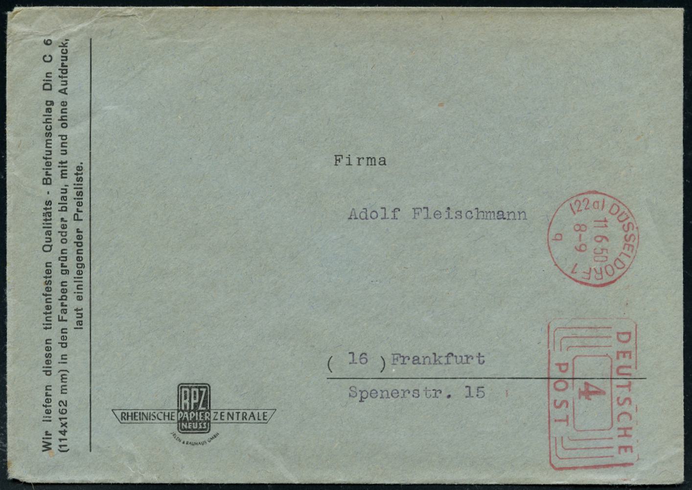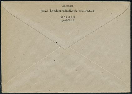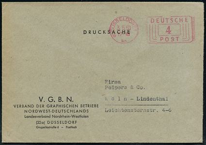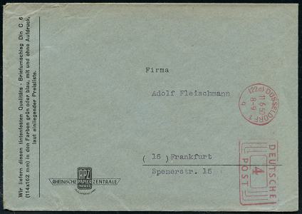 6370 | 8 € | 4000 Düsseldorf Post-Freistempel : (22a) DÜSSELDORF 1/ q/ DEUTSCHE/ POST 1950 (11.6.) Linien-PFS 4 Pf. mit UB "q" , Firmen-Bf.: RPZ RHEINISCHE PAPIER ZENTRALE (Dü.D-10, Nr.263) | ![]() | |