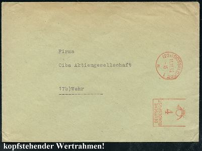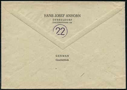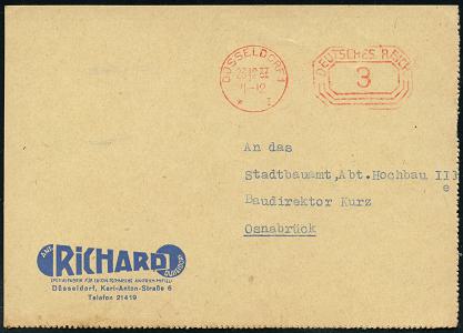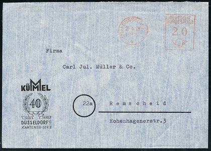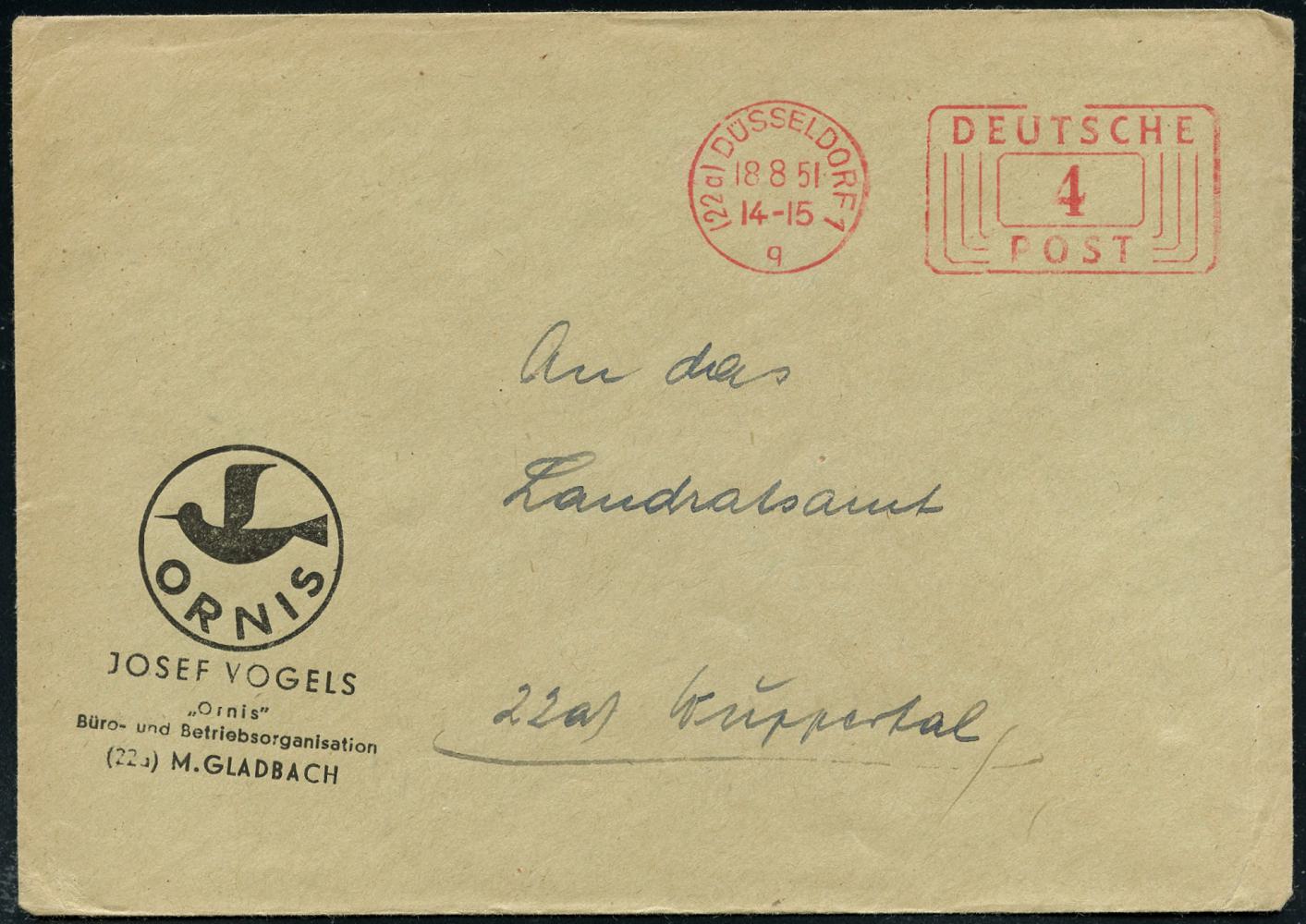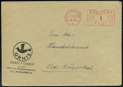 6371 | 8 € | 4000 Düsseldorf Post-Freistempel : (22a) DÜSSELDORF 1/ q/ DEUTSCHE/ POST 1951 (18.8.) Linien-PFS 4 Pf. mit UB "q" auf Firmen-Bf.: ORNIS, JOSEF VOGELS:: Büro- u. Betriebsorganisation.. (Logo) (Dü.D-10, Nr.253) | ![]() | |