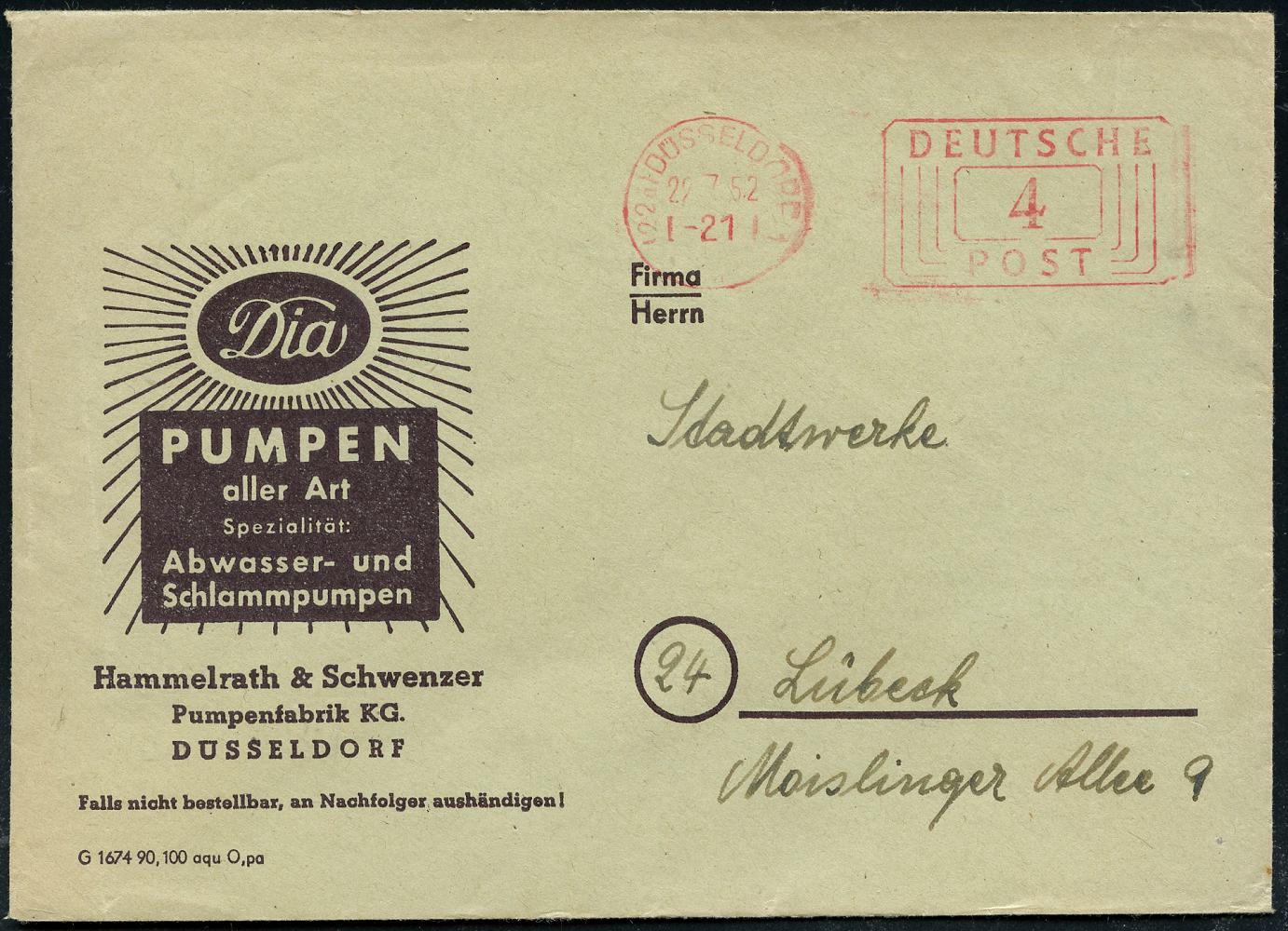 6373 | 8 € | 4000 Düsseldorf Post-Freistempel : (22a) DÜSSELDORF 1/ m/ DEUTSCHE/ POST 1952 (22.7.) Linien-PFS 4 Pf. auf Firmen-Bf.: Dia PUMPEN aller Art.. (Dü.D-10, Nr.253) | ![]() | |