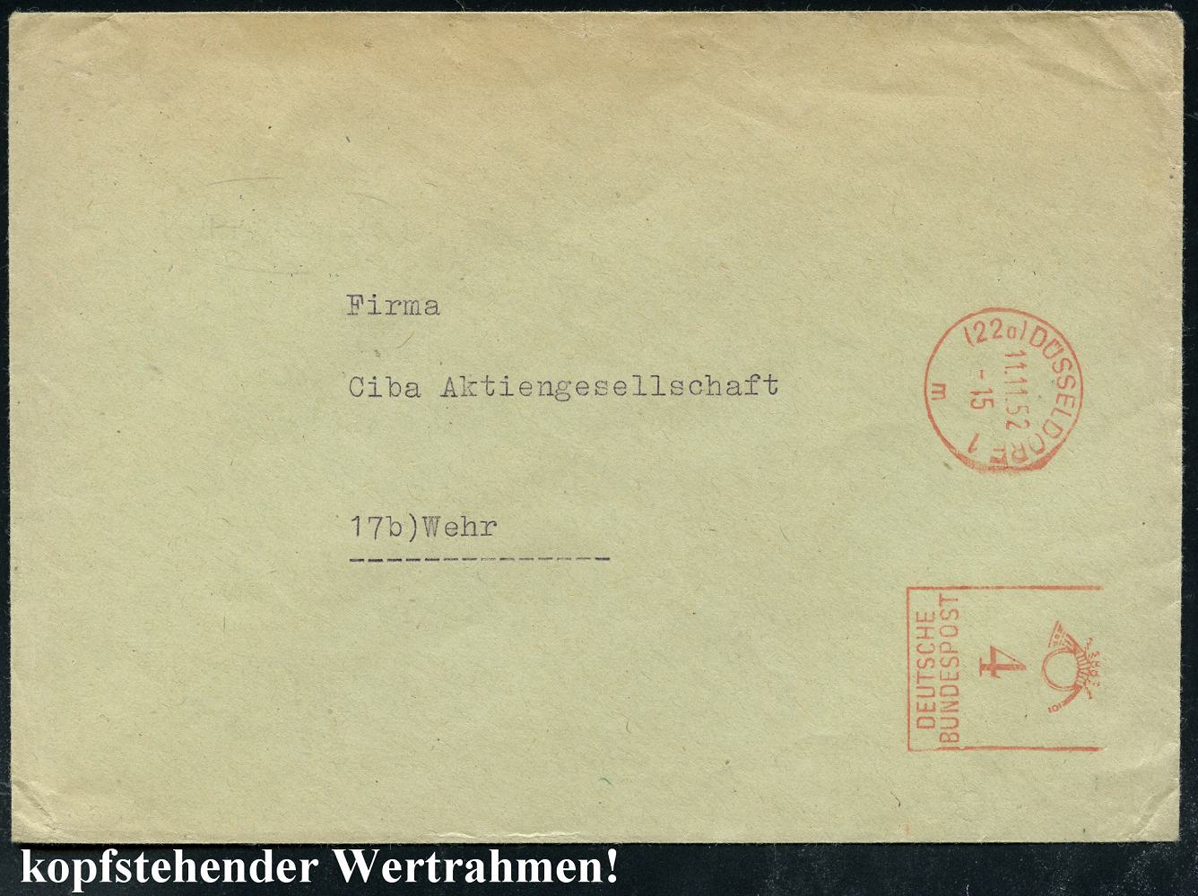 6375 | 25 € | 4000 Düsseldorf Post-Freistempel : (22a) DÜSSELDORF 1/ m/ DEUTSCHE/ BUNDESPOST 1952 (11.11.) PFS "Posthorn" 4 Pf. mit kopfstehendem Wertrahmen! , Firmen-Bf. (rs. Abs.: Irex KG, RICHTER & CO..) seltener Drs.-Bf. (Dü.D-17, Abart Kopfsteher!) | ![]() | |