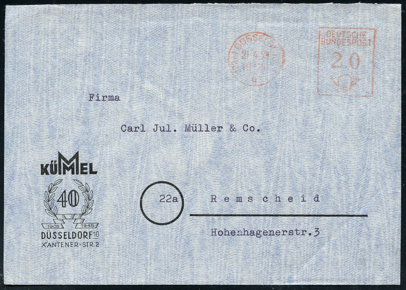 6376 | 10 € | 4000 Düsseldorf Post-Freistempel : (22a) DÜSSELDORF 1/ q/ DEUTSCHE/ BUNDESPOST 1953 (21.4.) PFS "Posthorn" 20 Pf. = Briefporto! auf Firmen-Jubil.-Bf.: KÜMMEL 40 (Jahre) 1905 1945, Fern-Bf. (Dü,D-17) | ![]() | |