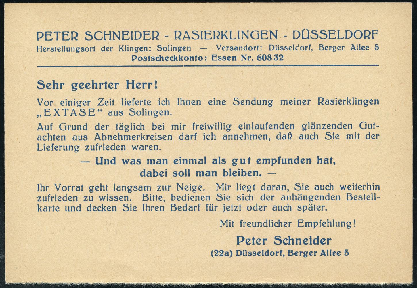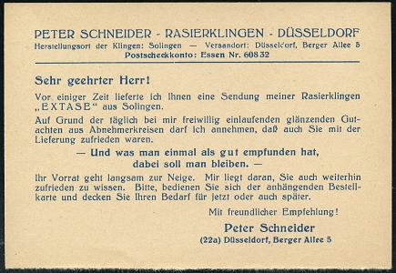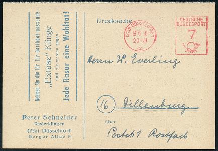 6377 | 10 € | 4000 Düsseldorf Post-Freistempel : (22a) DÜSSELDORF 1/ cc/ DEUTSCHE/ BUNDESPOST 1956 (13.6.) PFS "Posthorn" 7 Pf. mit UB "cc" u. Uhrzeit , (halbe) Reklame-Kt.: Peter Schneider, Rasierklingen.. (Dü.D-17) | ![]() ![]() | |