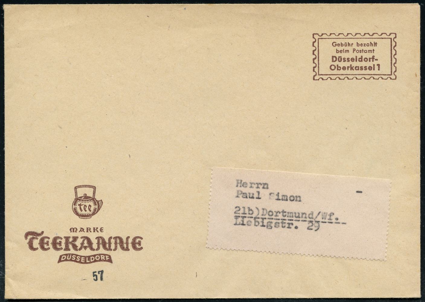 6378 | 5 € | 4000 Düsseldorf Post-Freistempel : Düsseldorf-Oberkassel 1 1957 Firmen-Bf.: MARKE TEEKANNE.. mit gedrucktem Gebührenfeld: Gebühr bezahlt.. (Teekanne) Inl.-Drs. | ![]() | |