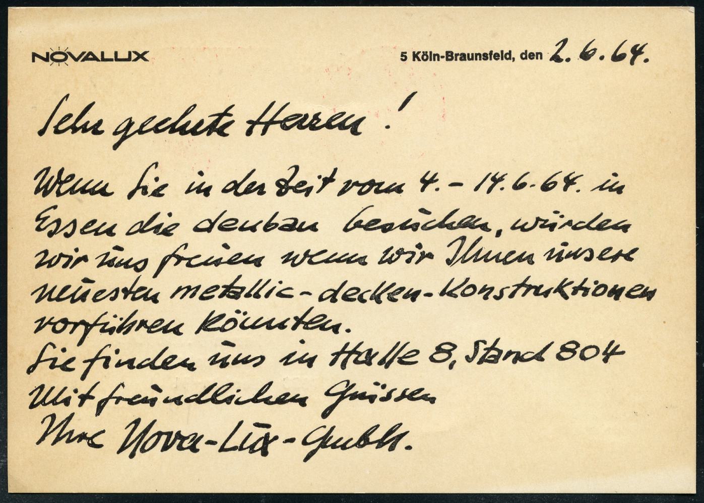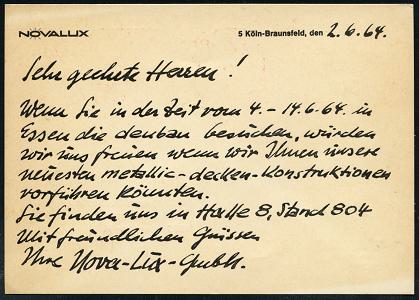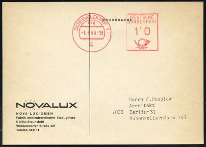 6379 | 8 € | 4000 Düsseldorf Post-Freistempel : 4 DÜSSELDORF 1/ mq/ DEUTSCHE/ BUNDESPOST 1964 (4.6.) PFS "Posthorn" mit neuer PLZ 10 Pf. mit Uhrzeit , Firmen-Reklame-Kt.: NOVALUX.. Fabrik elektrotechn. Erzeugnisse (Dü.D-17) | ![]() ![]() | |